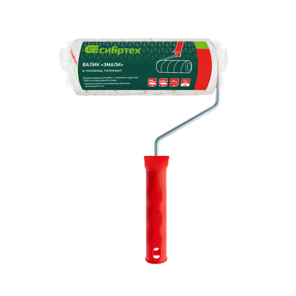Валик Сибртех «Эмали» 80196 из полиамида и полиакрила, с ручкой 6 мм, роликом 180 х 48 мм, длиной ворса 12 мм, предназначен для проведения малярных работ. Валик повышенной износостойкости можно использовать для нанесения любых ЛКМ, в том числе содержащих агрессивные вещества, на поверхности с различной фактурой. Рекомендован для работ с эмалями.