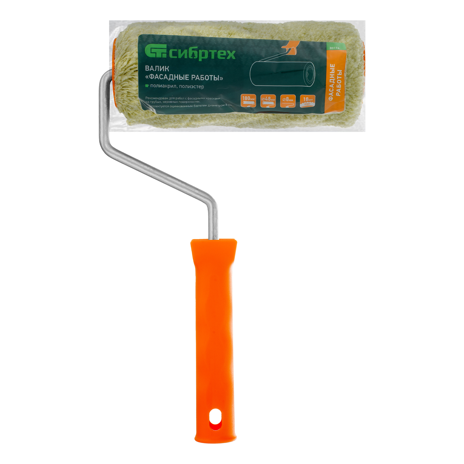 Валик Сибртех «Фасадные работы» 80174 с ворсом 18 мм из полиакрила и полиэстера, роликом 180 х 48 мм, ручкой 8 мм, рассчитан на проведение наружных работы с фасадными красками. Валик эффективен для обработки поверхностей с грубой фактурой и неровностями. Полиакрил в составе шубки повышает ее формостойкость и устойчивость к разрывным нагрузкам.