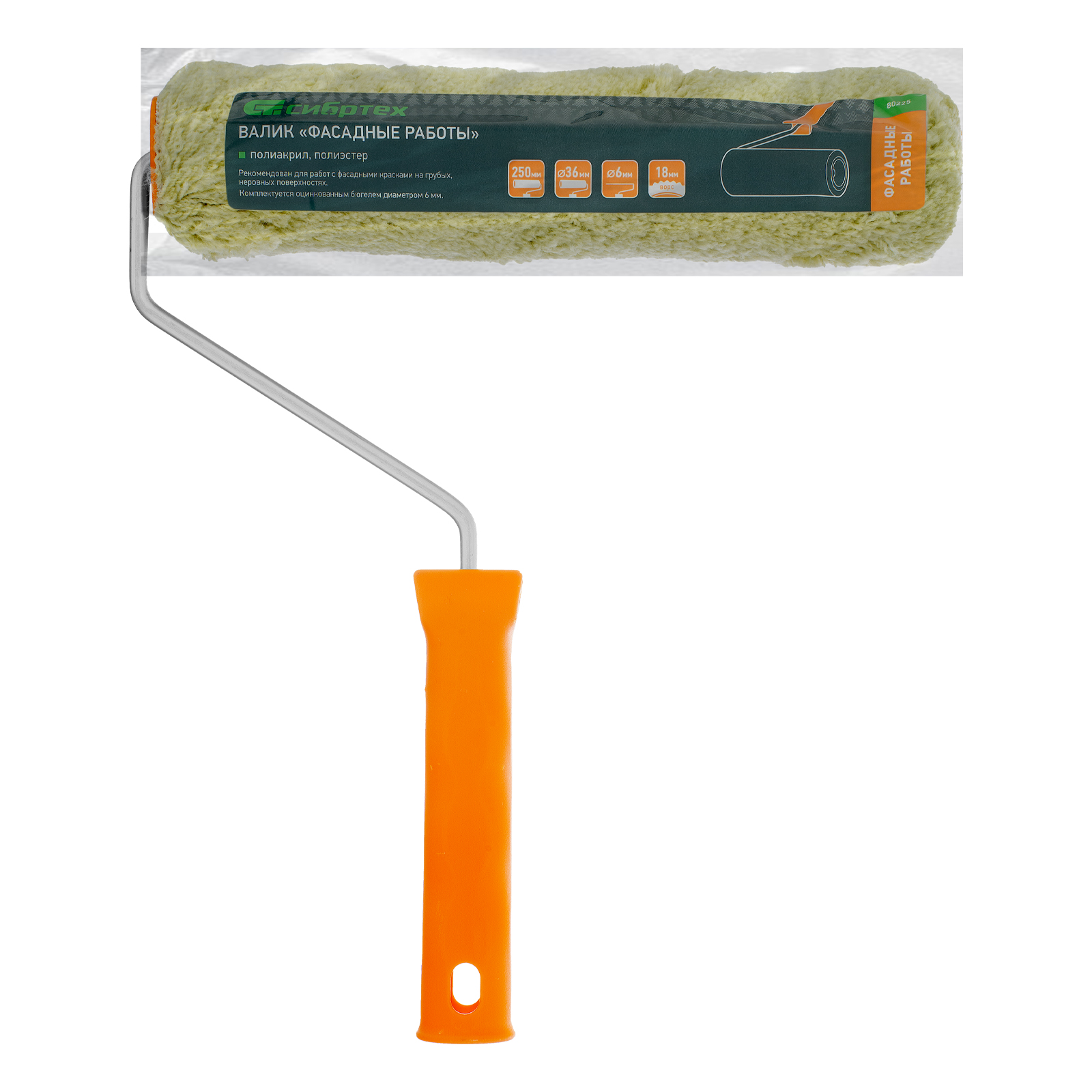 Валик Сибртех «Фасадные работы» 80225 с ворсом 18 мм из полиакрила и полиэстера, роликом 250 х 36 мм, ручкой 6 мм, рассчитан на наружные работы с фасадными красками. Валик эффективен для обработки поверхностей с грубой фактурой и неровностями. Полиакрил в составе шубки повышает ее формостойкость и устойчивость к разрывным нагрузкам.