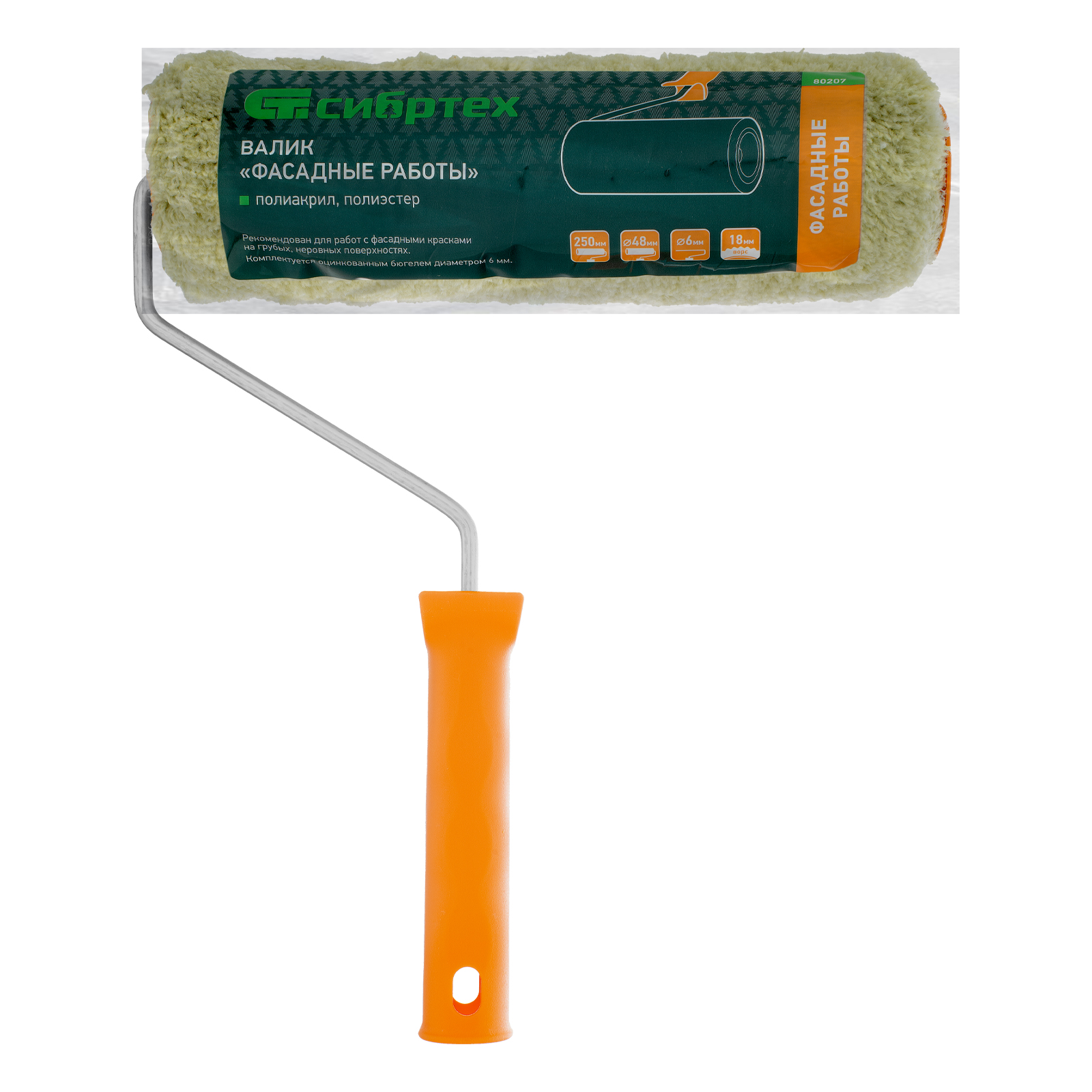Валик Сибртех «Фасадные работы» 80207 с ворсом 18 мм из полиакрила и полиэстера, роликом 250 х 48 мм, ручкой 6 мм, рассчитан на наружные работы с фасадными красками. Валик эффективен для обработки поверхностей с грубой фактурой и неровностями. Полиакрил в составе шубки повышает ее формостойкость и устойчивость к разрывным нагрузкам.