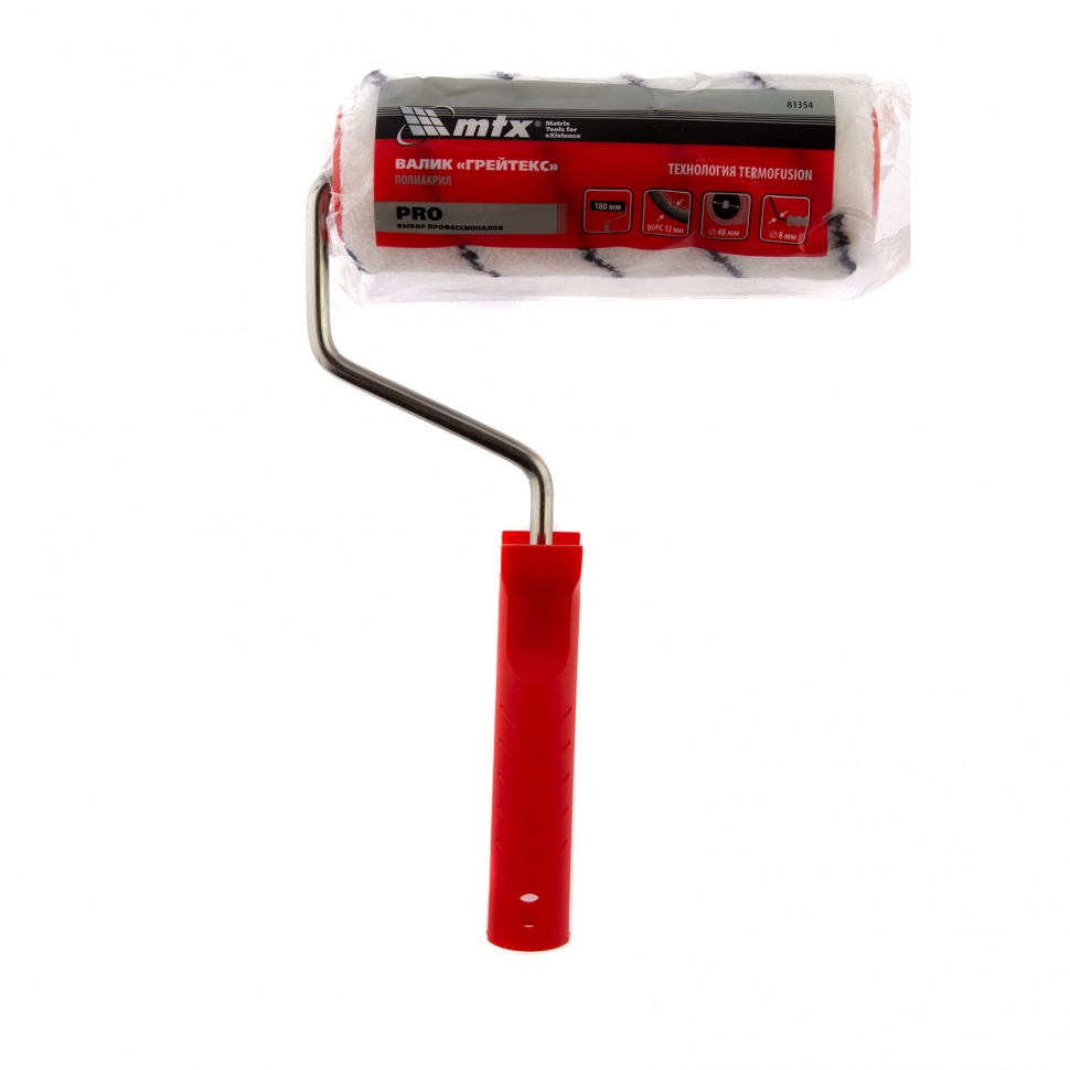 Валик MTX PRO «ГРЕЙТЕКС» 81354 с ворсом из полиакрила 12 мм, диаметром ролика 48 мм и шириной 180 мм, с ручкой 8 мм, предназначен для общемалярных работ на больших участках внутри помещений. Валик оптимален для окрашивания среднегладких поверхностей.