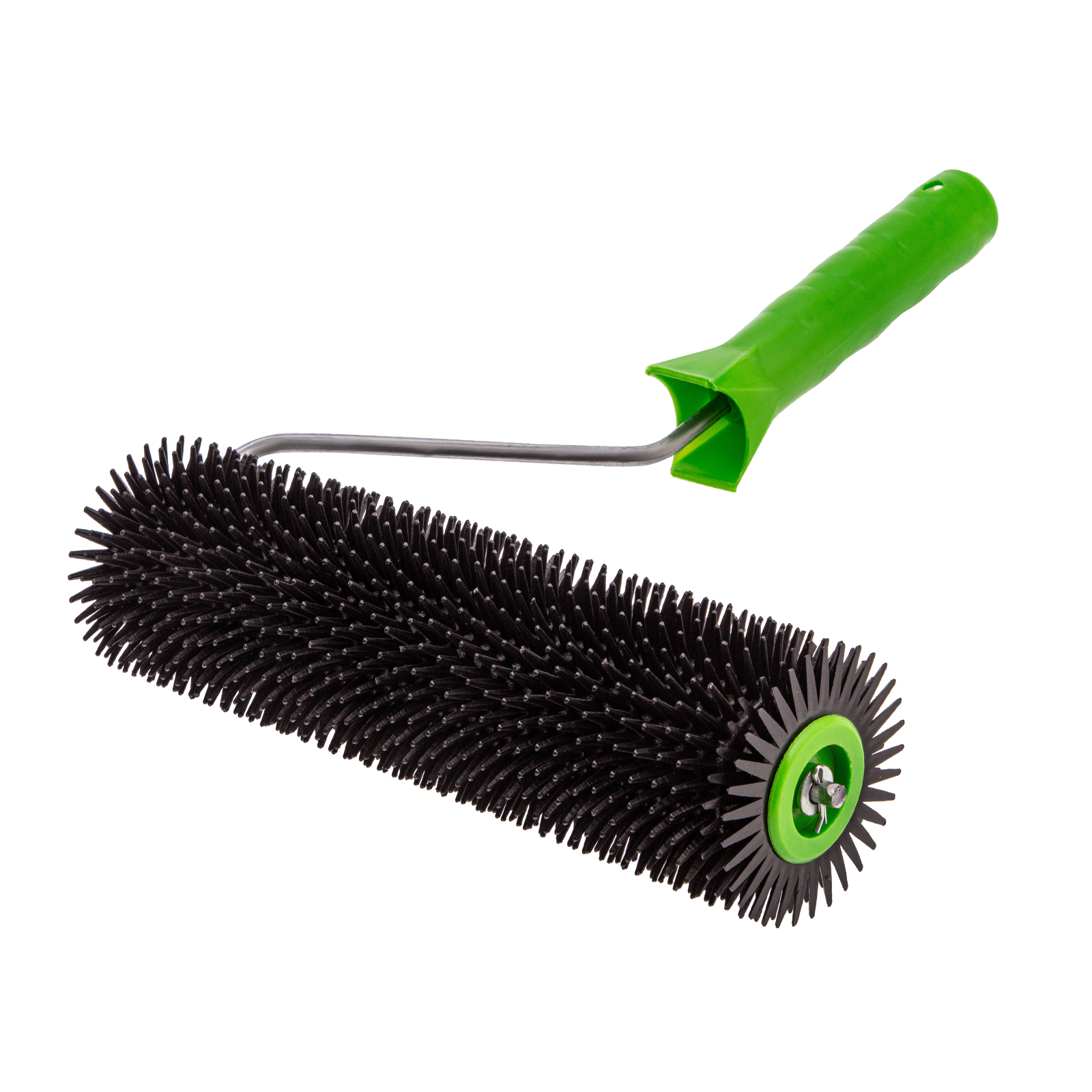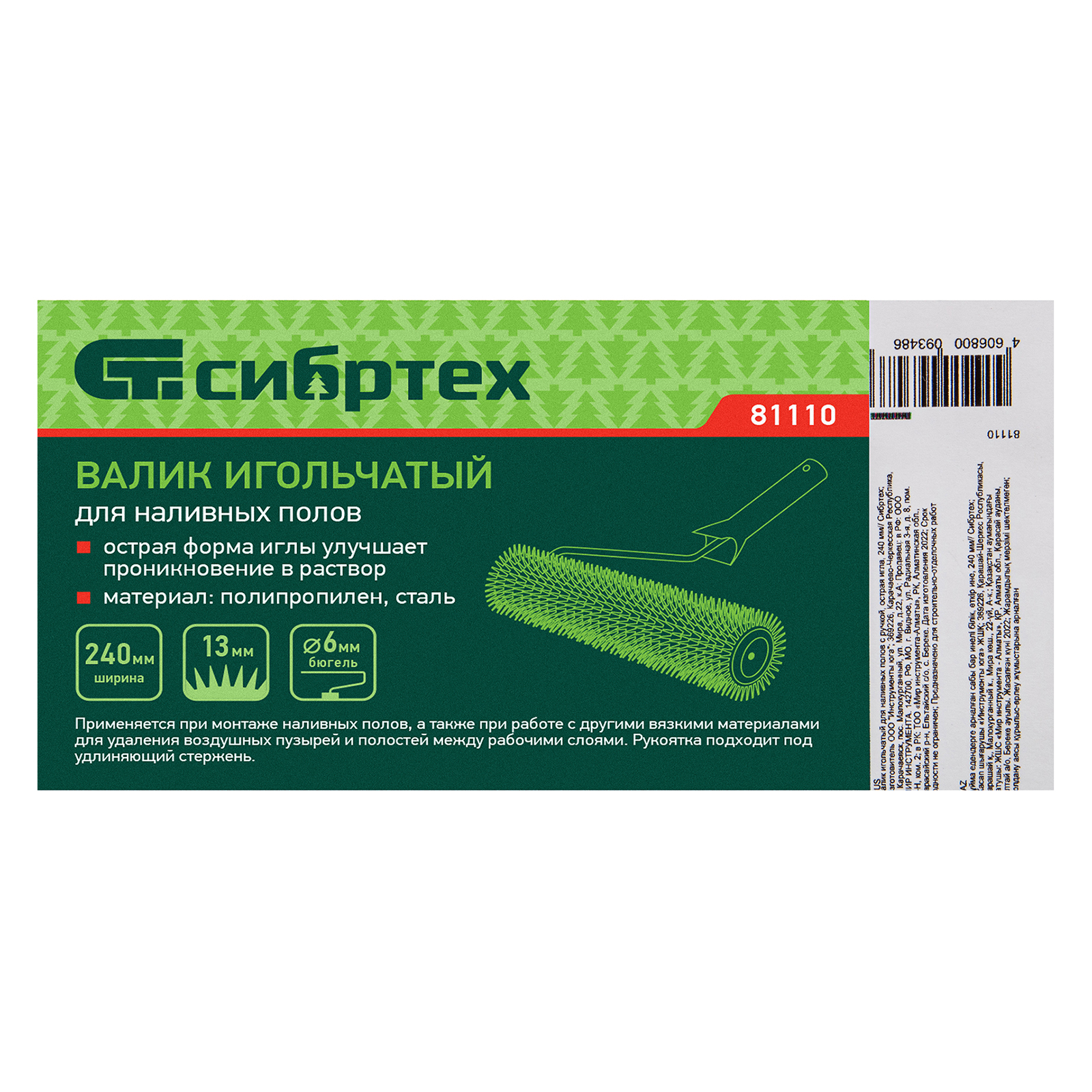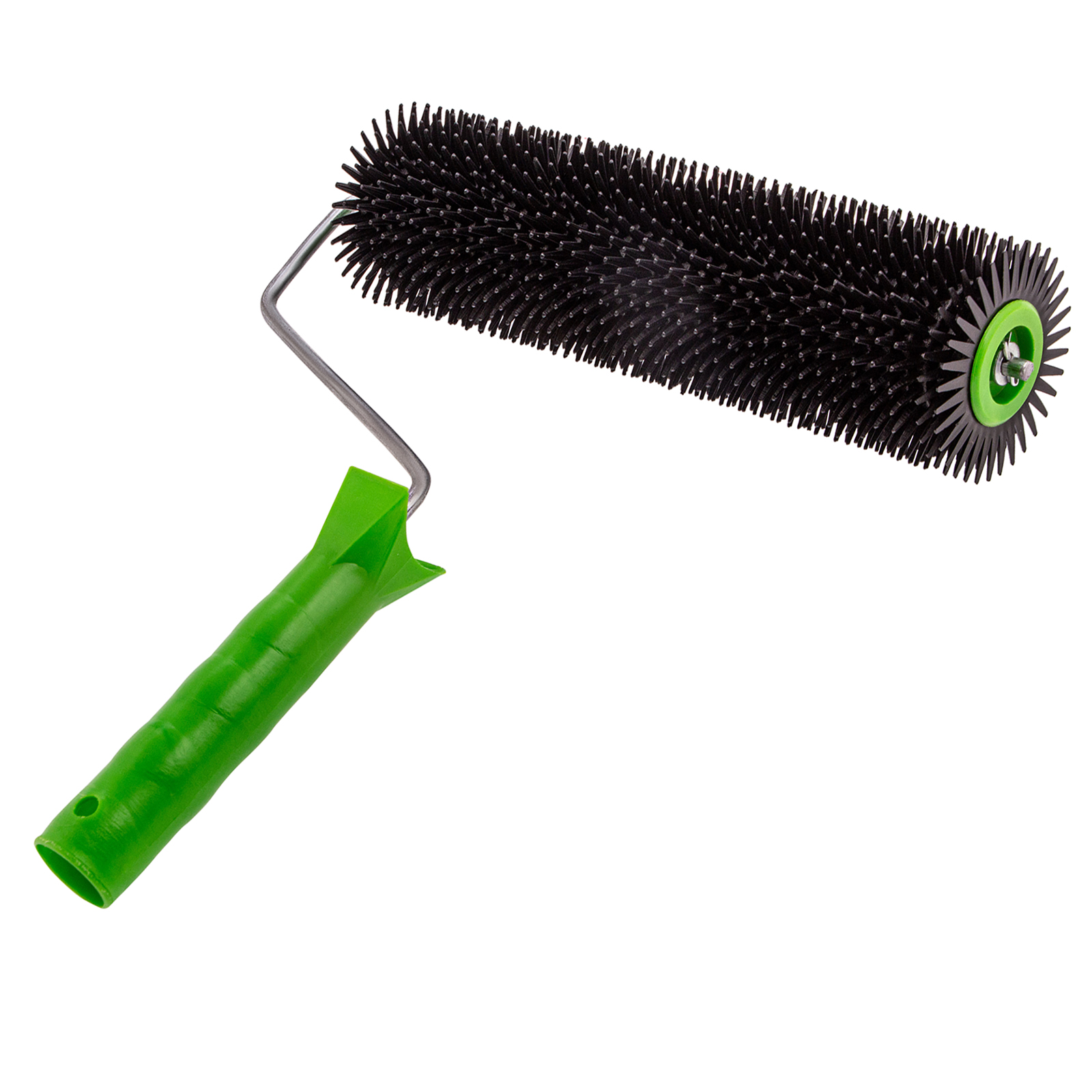 Игольчатый валик Сибртех 81110 шириной 240 мм, с рукояткой и острыми иглами длиной 14 мм, применяется для монтажа наливных полов, а также выполнения работ с другими вязкими материалами. Эффективно удаляет воздушные пузыри и полости между рабочими слоями. Подходит для покрытий небольшой толщины.