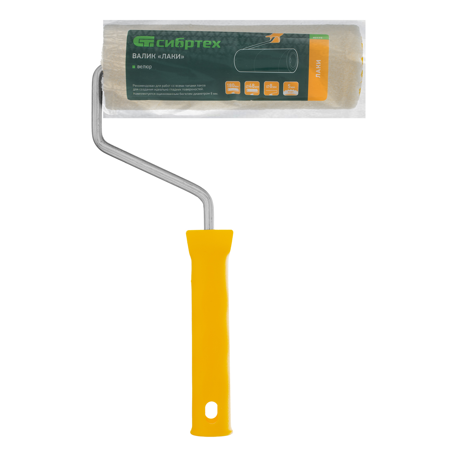 Валик Сибртех «Лаки» 80178 с ворсом длиной 5 мм из велюра, ручкой 8 мм, роликом 180 х 48 мм, обеспечивает нанесение ЛКМ тонким слоем, что делает его лучшим помощником для работ с лаками на гладких поверхностях. Валик шириной 180 мм быстро справляется с окрашиванием участков большой площади.
