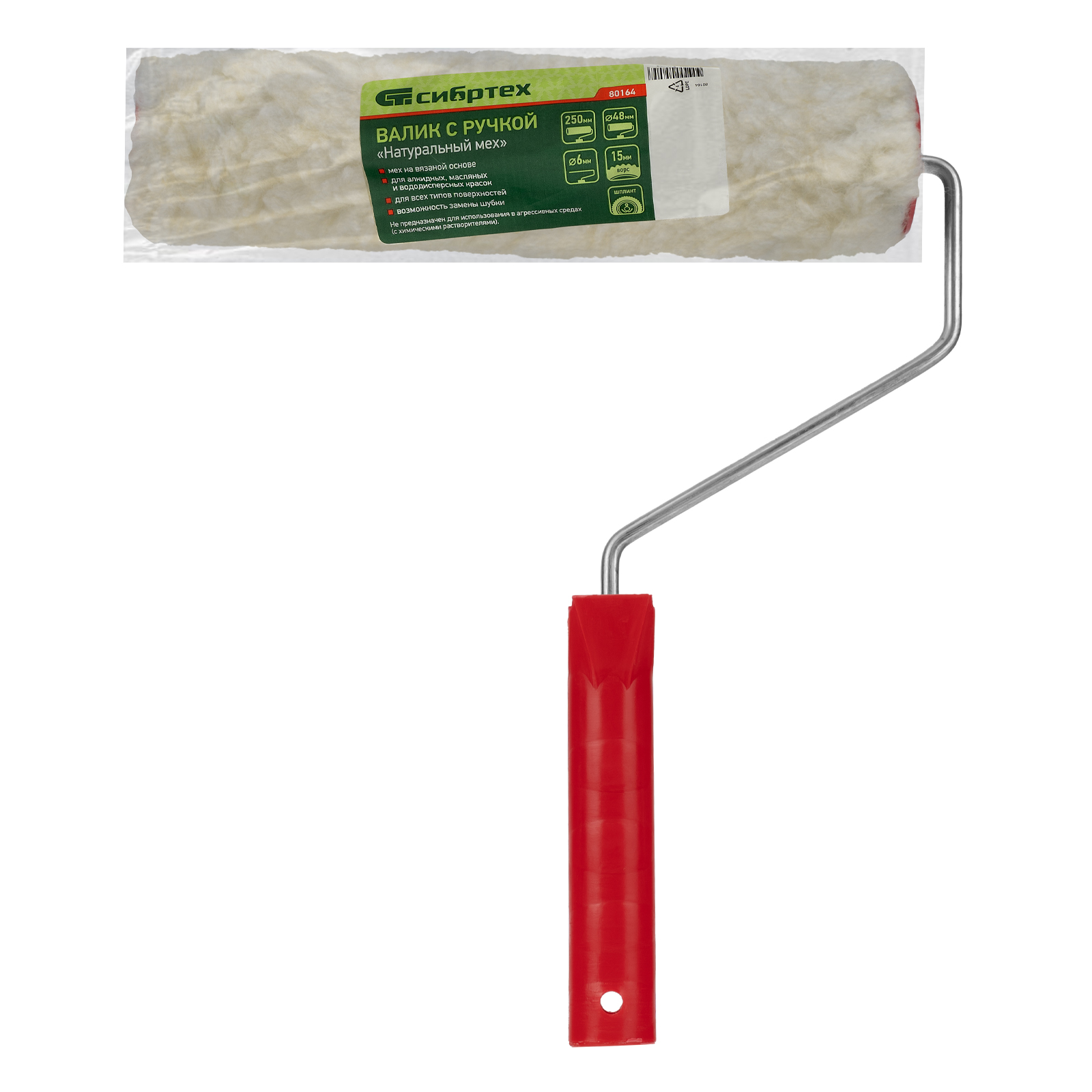 Валик в сборе Сибртех «Натуральный мех» 80164 в сборе с ручкой 6 мм, роликом 250 х 48 мм (крепление шплинтом), применяется при окрашивании фасадов зданий, стен, потолков и т.д. С его помощью можно работать с алкидными, масляными и водно-дисперсионными составами.