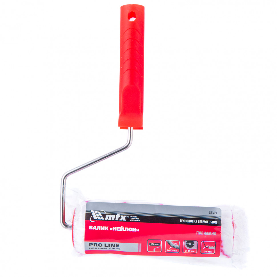 Полиамидный валик MTX «НЕЙЛОН» PRO LINE 81309 шириной 180 мм, с диаметром ролика 48 мм, диаметром бюгеля 6 мм и длиной ворса 9 мм, предназначен для интерьерных работ. За счет длины ворса 9 мм валик качественно окрашивает гладкие поверхности. Ширина 180 мм позволяет обрабатывать участки большого размера.