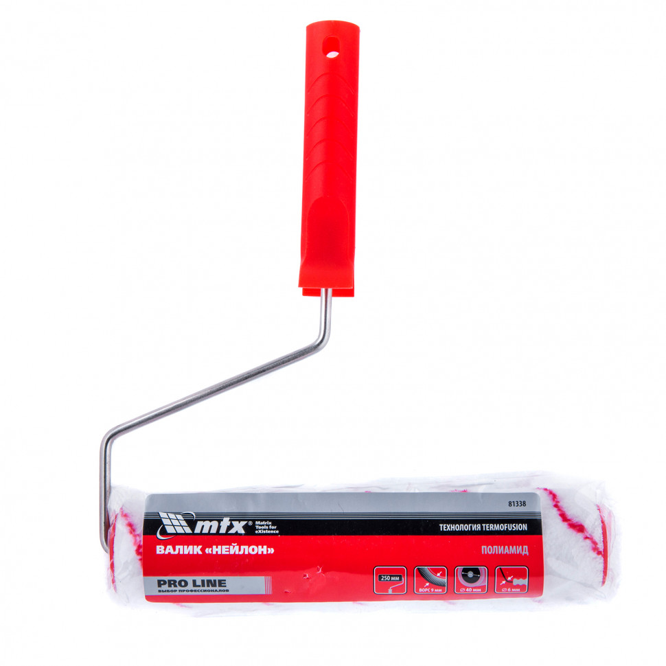 Полиамидный валик MTX «НЕЙЛОН» PRO LINE 81338 шириной 250 мм, с диаметром ролика 40 мм, диаметром бюгеля 6 мм и длиной ворса 9 мм, предназначен для интерьерных работ. За счет длины ворса 9 мм валик качественно окрашивает гладкие поверхности. Ширина 250 мм позволяет обрабатывать участки большого размера.