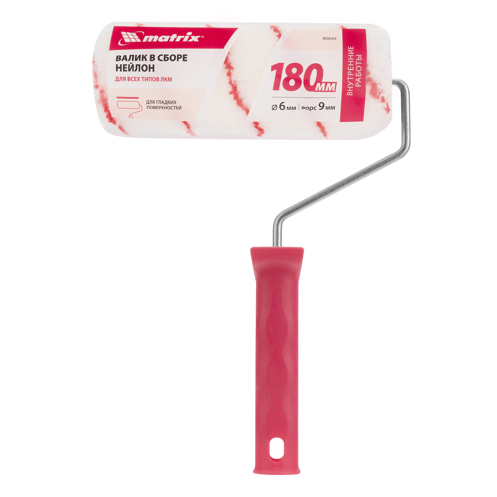 Валик Matrix 80645 «Нейлон Стандарт» 180 мм с полиамидным ворсом длиной 9 мм, диаметром ролика 48 мм и диаметром ручки 6 мм предназначен для нанесения любых типов лакокрасочных материалов на гладкие и средне-гладкие поверхности. Ширина 180 мм позволяет эффективно и быстро окрашивать большие площади: стены, потолки, фасады и т.д.