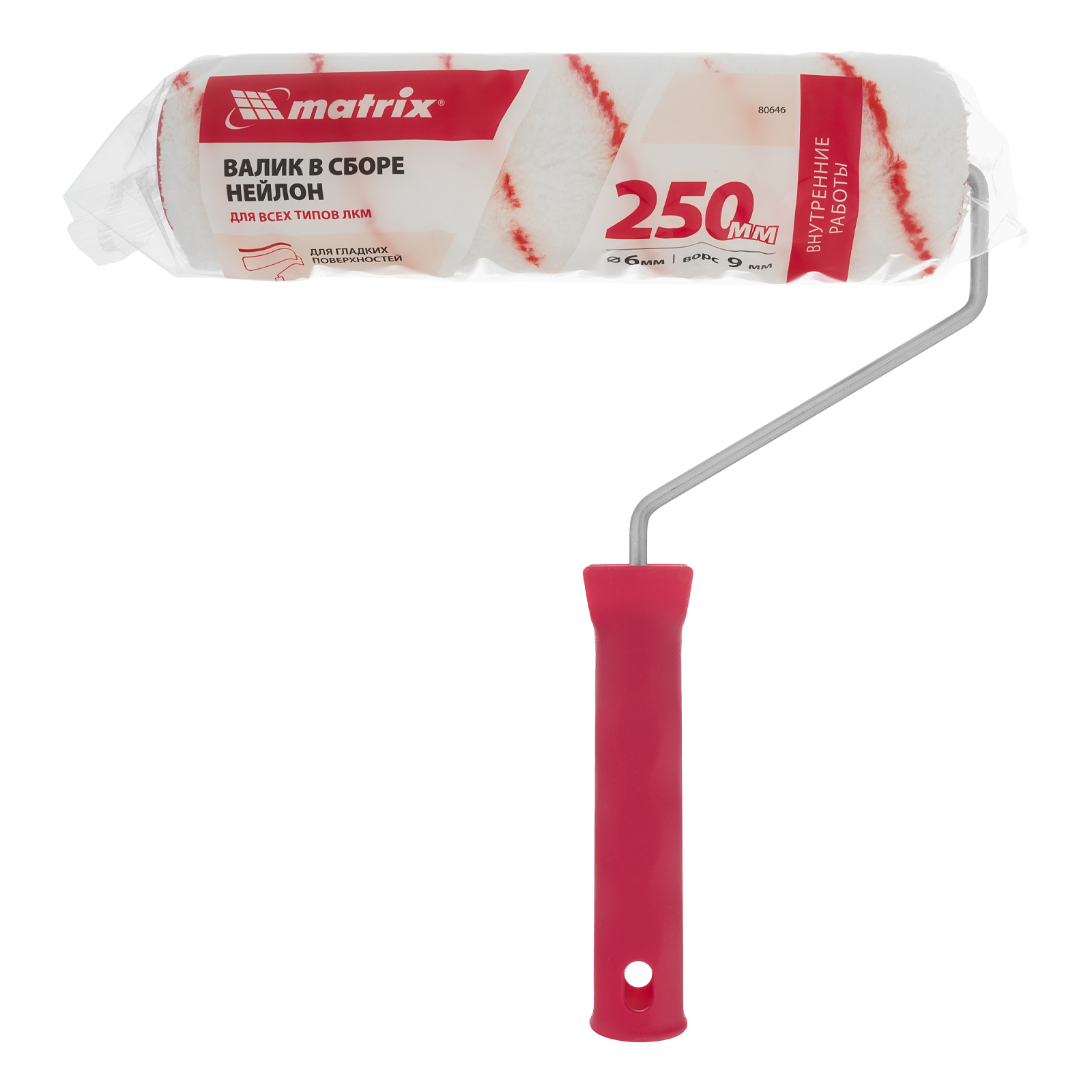 Валик Matrix 80646 «Нейлон Стандарт» 250 мм с полиамидным ворсом длиной 9 мм, диаметром ролика 48 мм и диаметром ручки 6 мм предназначен для нанесения любых типов лакокрасочных материалов на гладкие и средне-гладкие поверхности. Ширина 250 мм позволяет эффективно и быстро окрашивать большие площади: стены, потолки, фасады и т.д.