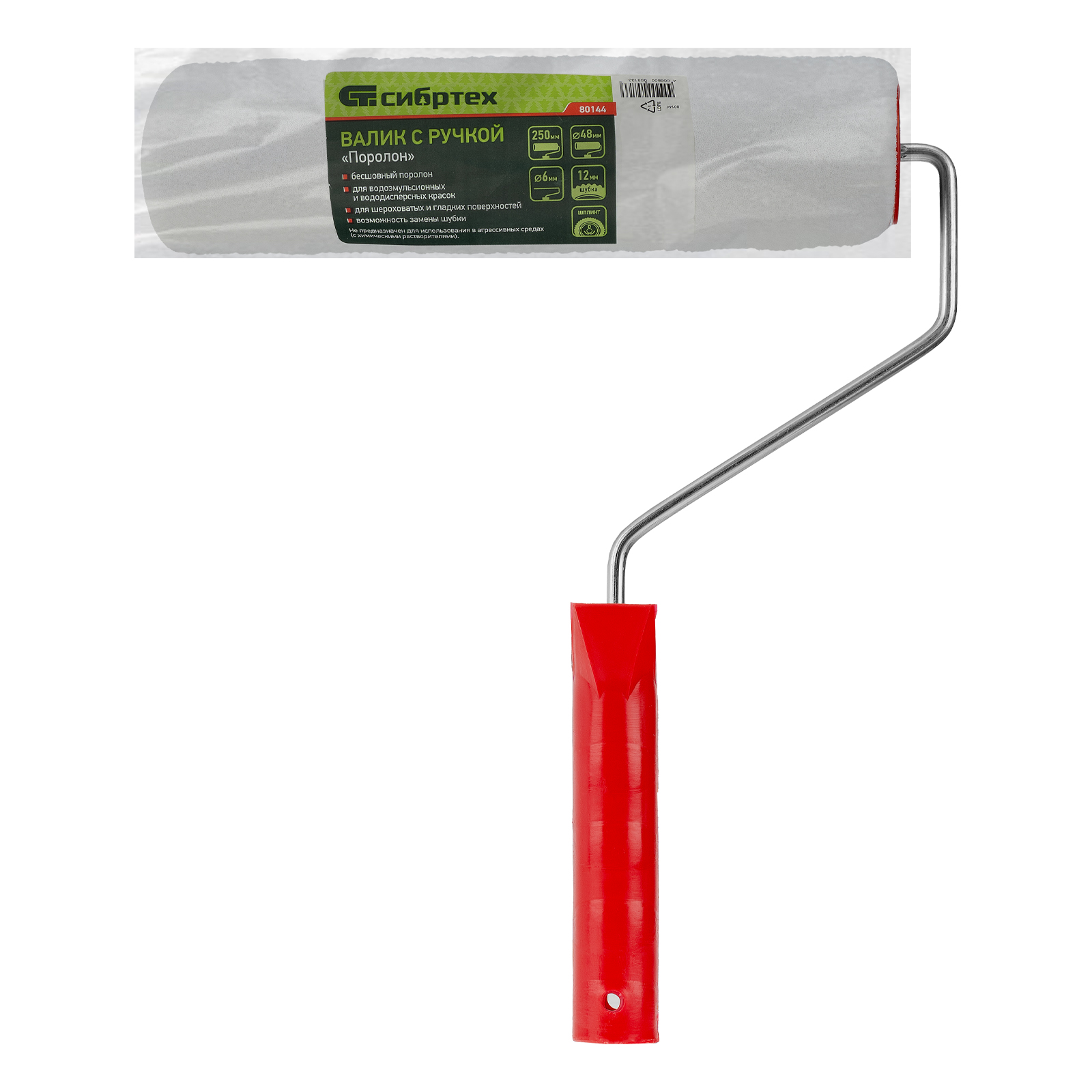 Валик в сборе Сибртех «Поролон» 80144 с роликом 250 х 48 мм и ручкой диаметром 6 мм, креплением шплинтом, оптимален для обработки поверхностей с гладкой и шероховатой фактурой. Валик применяется для нанесения водно-дисперсионных красок, клеевых составов на водной основе и грунтовок во время подготовительных или малярных работ. Шубка из поролона обладает хорошими показателями впитываемости.