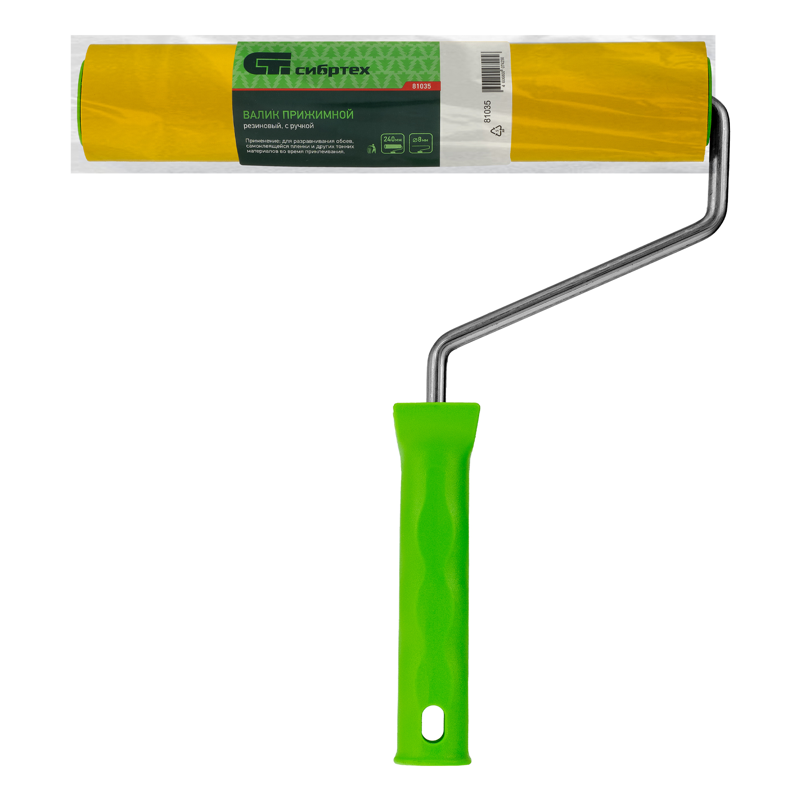 Резиновый прижимной валик Сибртех 81035 длиной 240 мм, с ручкой диаметром 8 мм, используется для ремонтно-строительных работ. Подходит для наклеивания всех видов обоев, а также других тонких листовых материалов. Позволяет быстро и равномерно разгладить полотно на стыках, удалив пузырьки воздуха.