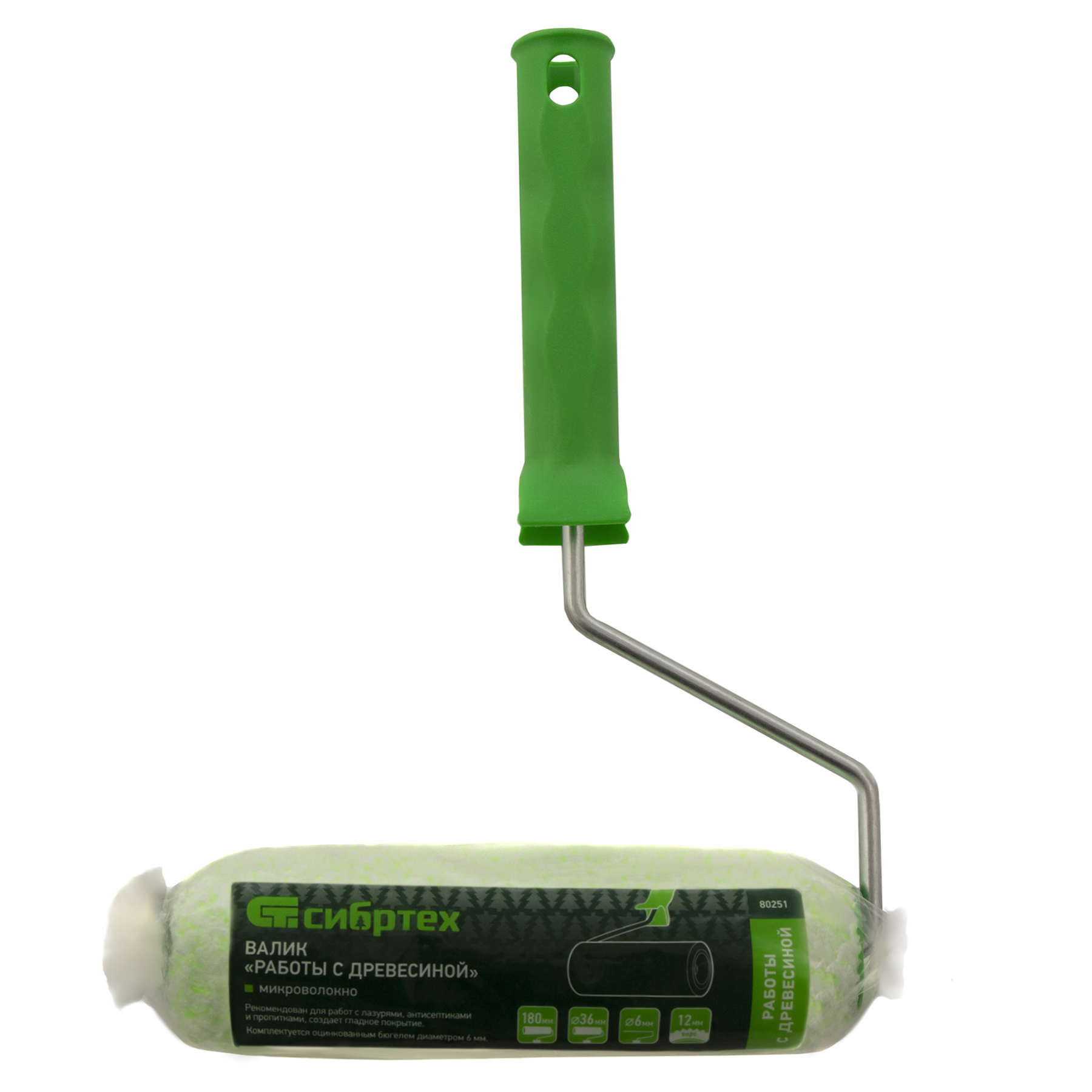 Валик Сибртех «Работы с древесиной» 80251 шириной 180 мм, ворсом 12 мм из микроволокна, диаметром ролика 36 мм и ручкой 6 мм, оптимален для работ с жидкими лакокрасочными материалами: антисептиками, грунтовками, пропитками, защитными составами, лазурью и другими невязкими ЛКМ. Шубка из микроволокна отличается высокой впитывающей способностью и обеспечивает ровное нанесение материалов на древесину любой текстуры.