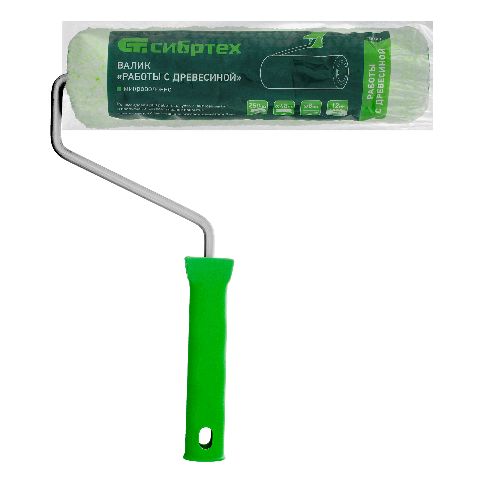 Валик Сибртех «Работы с древесиной» 80183 шириной 250 мм, ворсом 12 мм из микроволокна, диаметром ролика 48 мм и ручкой 8 мм, оптимален для работ с жидкими лакокрасочными материалами: антисептиками, грунтовками, пропитками, защитными составами, лазурью и другими невязкими ЛКМ. Шубка из микроволокна отличается высокой впитывающей способностью и обеспечивает ровное нанесение материалов на древесину любой текстуры.