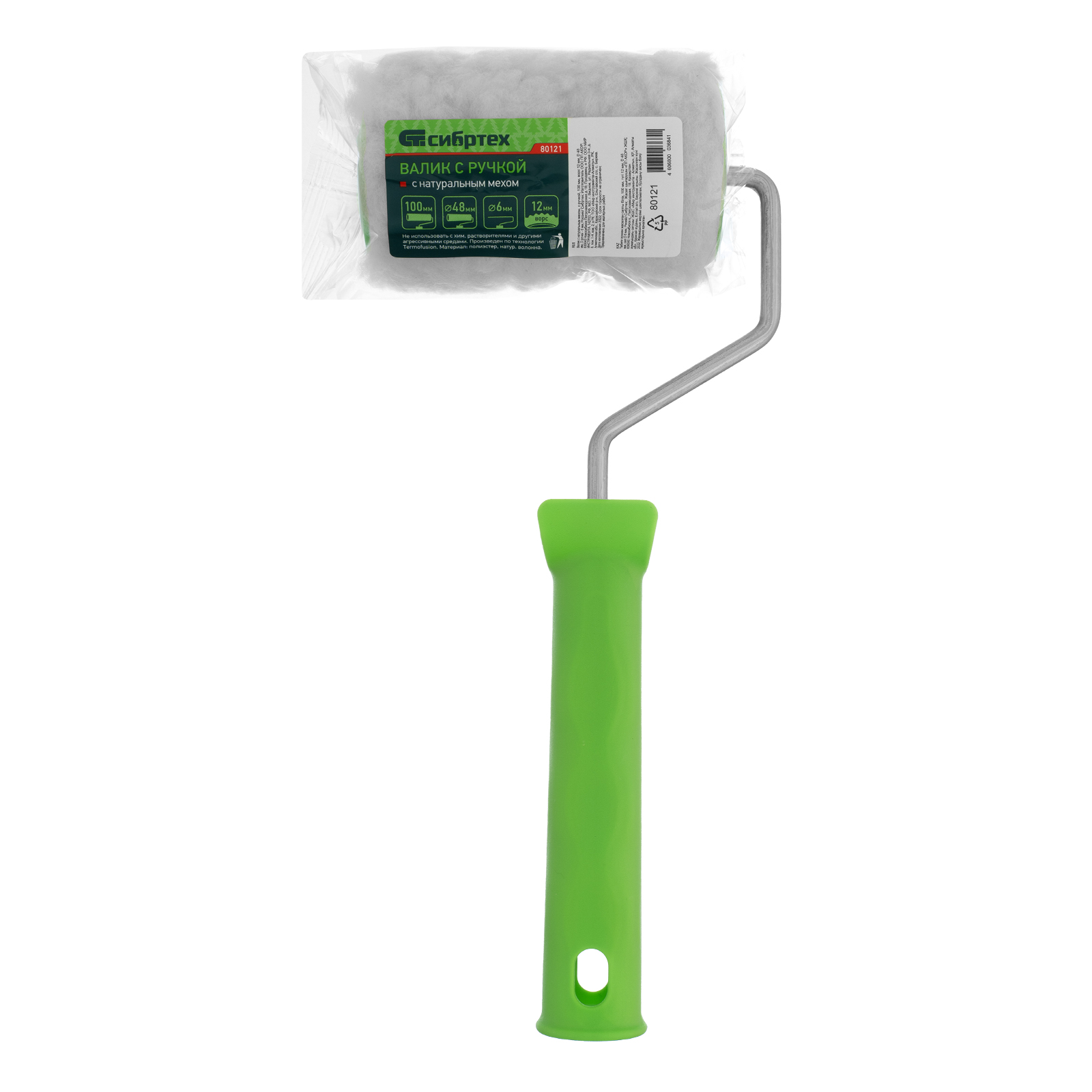 Валик с натуральным мехом Сибртех 80121, с ворсом 12 мм, ручкой 6 мм, диаметром ролика 48 мм и шириной 100 мм, позволяет работать с эмалями, масляными и водно-дисперсионными красками, а также защитными покрытиями. Благодаря длине ворса 12 мм валик подходит для окрашивания не только гладких, но и шероховатых поверхностей.