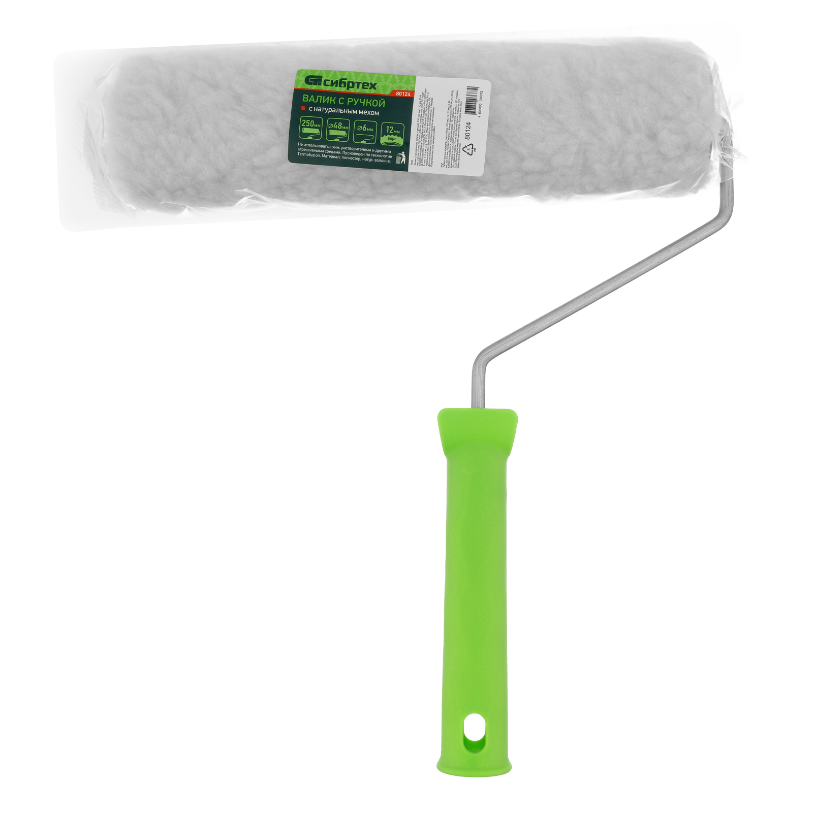 Валик с натуральным мехом Сибртех 80124, с ворсом 12 мм, ручкой 6 мм, диаметром ролика 48 мм и шириной 250 мм, позволяет работать с эмалями, масляными и водно-дисперсионными красками, а также защитными покрытиями. Благодаря длине ворса 12 мм валик подходит для окрашивания не только гладких, но и шероховатых поверхностей.