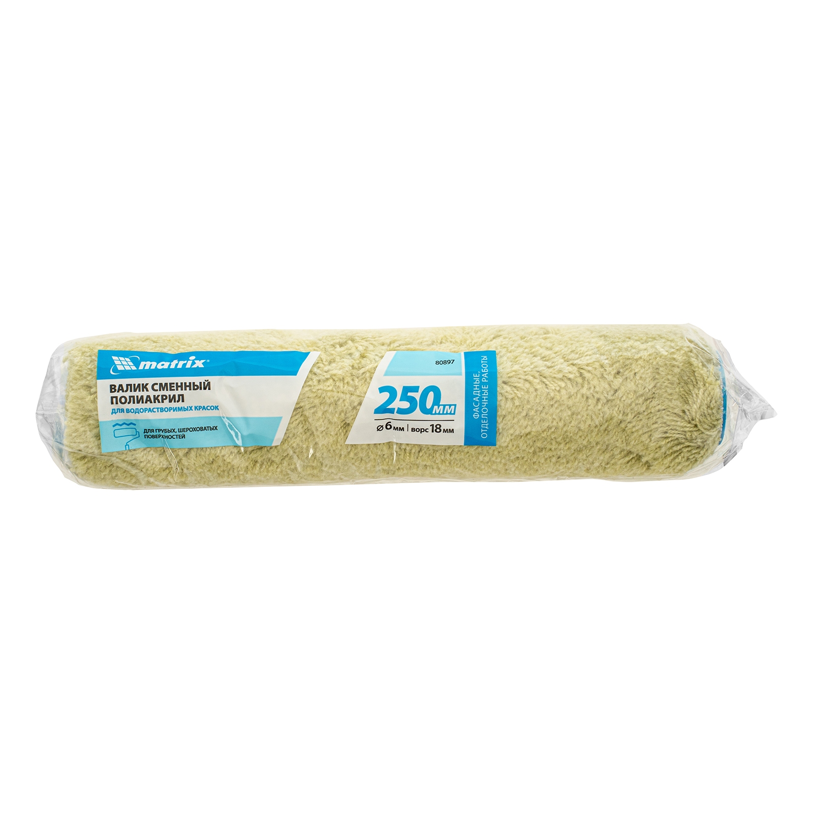 Синтетический сменный валик для фасадных работ Matrix 80897 с ворсом 18 мм из полиакрила, шириной 250 мм и диаметром 36 мм, устанавливается на бюгель 6 мм. Шубка с длинным ворсом полностью прокрашивает неровные поверхности с грубой фактурой: древесину, оштукатуренные стены, гофрированный металл, бетон и кирпич, внешние стены зданий и т.д. Полиакрил в составе шубки позволяет применять валик с любыми типами ЛКМ.
