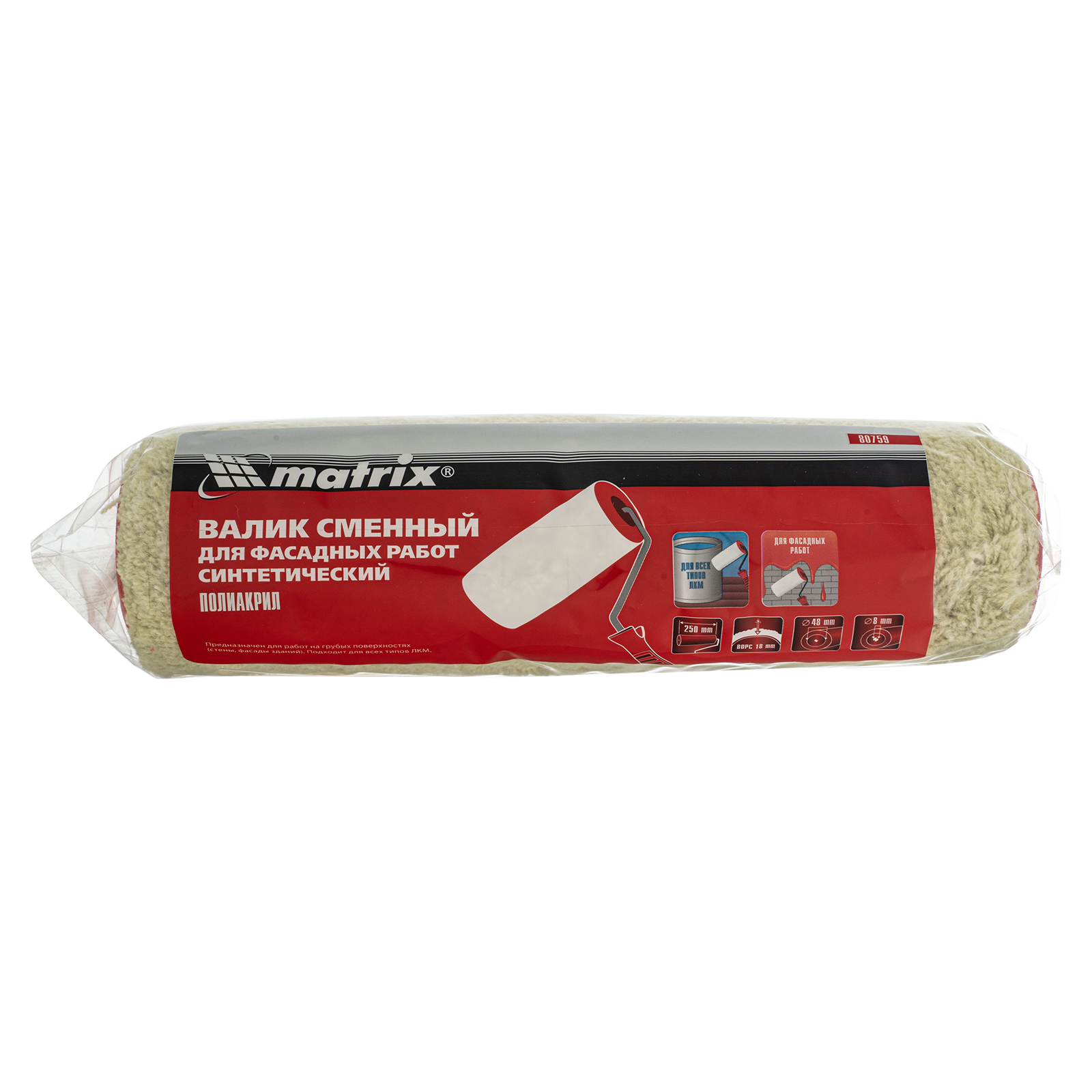 Синтетический сменный валик для фасадных работ Matrix 80759 с ворсом 18 мм из полиакрила, шириной 250 мм и диаметром 48 мм, устанавливается на бюгель 8 мм. Шубка с длинным ворсом полностью прокрашивает неровные поверхности с грубой фактурой: древесину, оштукатуренные стены, гофрированный металл, бетон и кирпич, внешние стены зданий и т.д. Полиакрил в составе шубки позволяет применять валик с любыми типами ЛКМ.