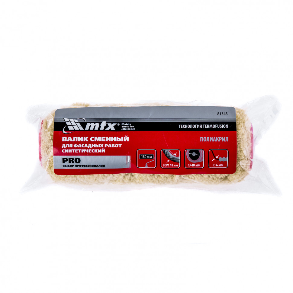 Синтетический сменный валик для фасадных работ MTX PRO 81343 с ворсом из полиакрила 18 мм устанавливается на ручку 6 мм. Благодаря ширине 180 мм и диаметру ролика 40 мм валик удобен при обработке больших площадей, поэтому рекомендуется для отделки внешних стен зданий. Длинный ворс позволяет качественно прокрашивать рельефные участки, в том числе гофрированный металл, грубую древесину, текстурные поверхности.