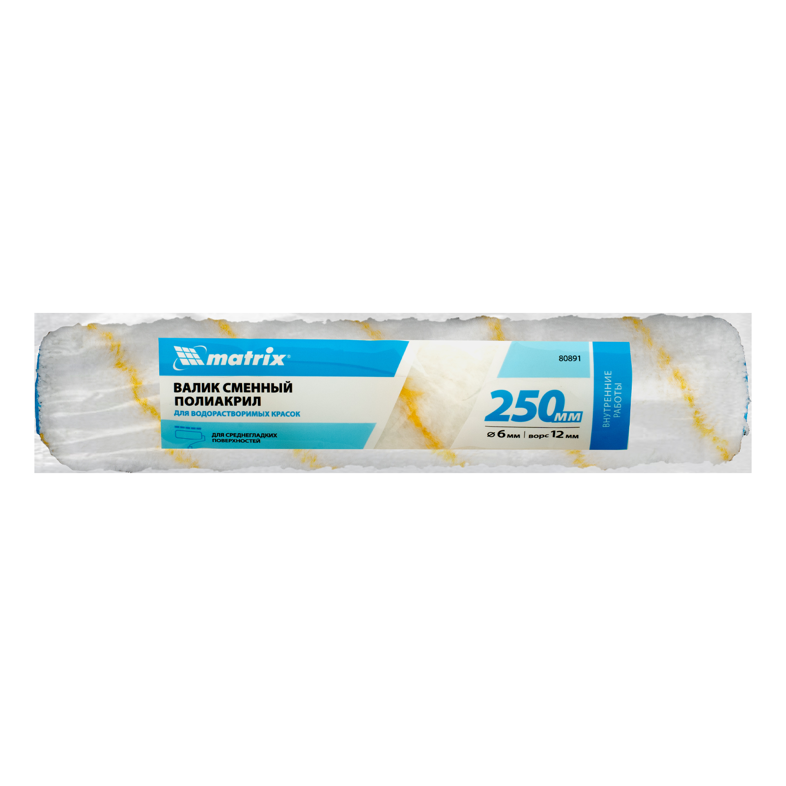 Сменный синтетический валик Matrix 80891 шириной 250 мм и диаметром 36 мм, под бюгель диаметром 6 мм, с ворсом 12 мм из полиакрила, оптимален для проведения малярных работ внутри помещений. Шубка с ворсом длиной 12 мм подходит для окрашивания средне-гладких поверхностей: полов, стен и потолков. Полиакрил в составе обеспечивает высокое качество работ с любыми типами ЛКМ, делает шубку износоустойчивой и формостойкой.