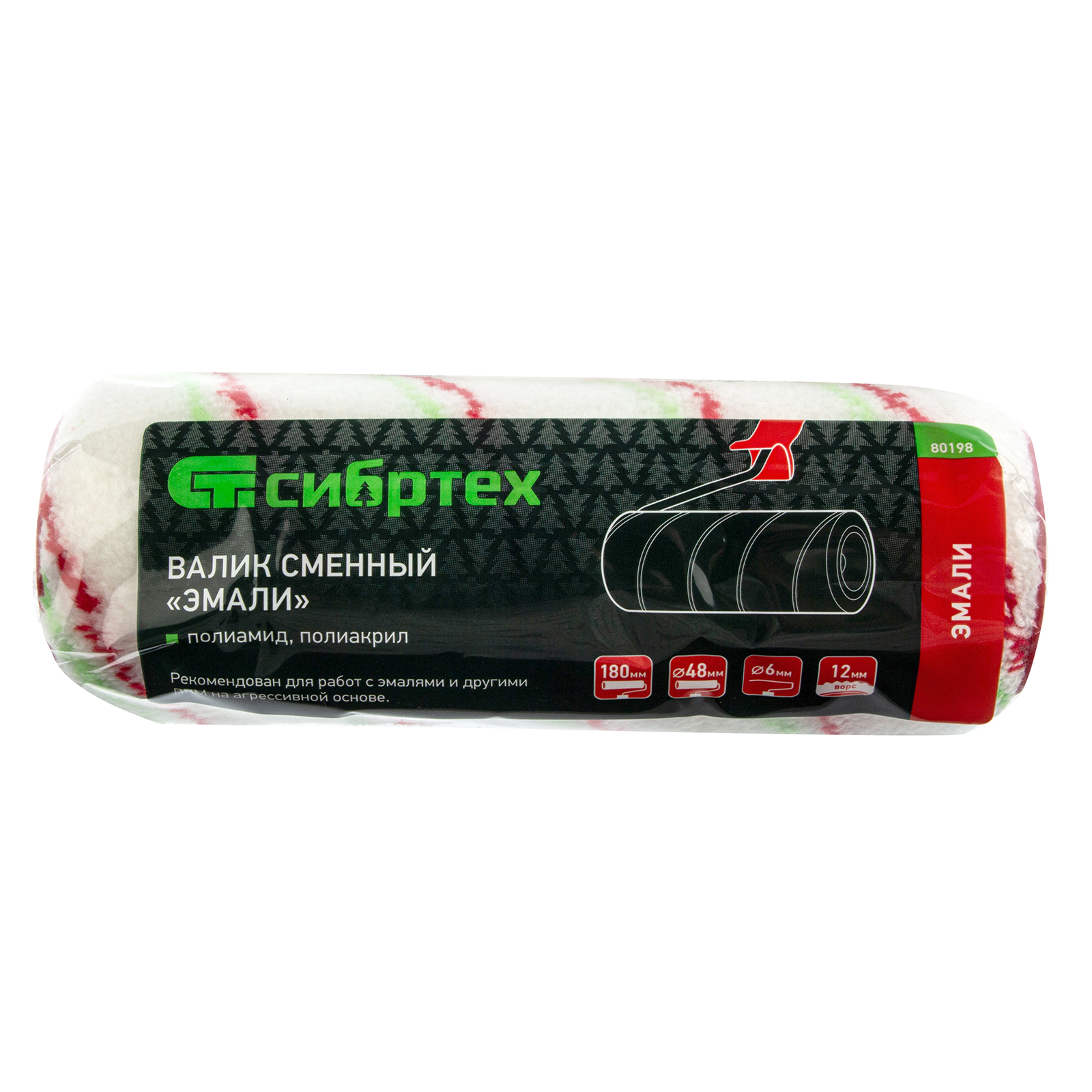Сменный валик Сибртех «Эмали» 80198 с ворсом 12 мм из полиамида и полиакрила, размером ролика 180 х 48 мм, под ручку 6 мм, подходит для проведения малярных работ с любыми типами лакокрасочных материалов, даже содержащих агрессивные вещества. За счет ворса средней длины подходит для поверхностей любого типа. Рекомендован для работ с эмалями.
