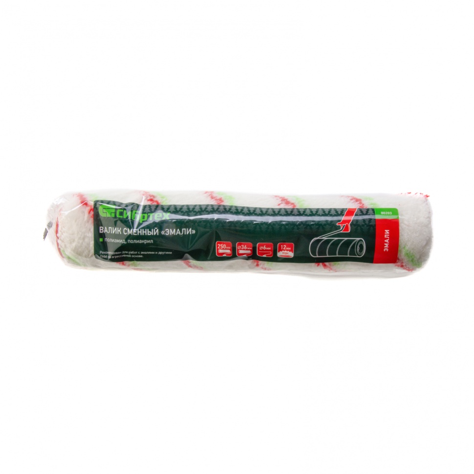 Сменный валик Сибртех «Эмали» 80203 с ворсом 12 мм из полиамида и полиакрила, размером ролика 250 х 36 мм, под ручку 6 мм, подходит для проведения малярных работ с любыми типами лакокрасочных материалов, даже содержащих агрессивные вещества. За счет ворса средней длины подходит для поверхностей любого типа. Рекомендован для работ с эмалями.