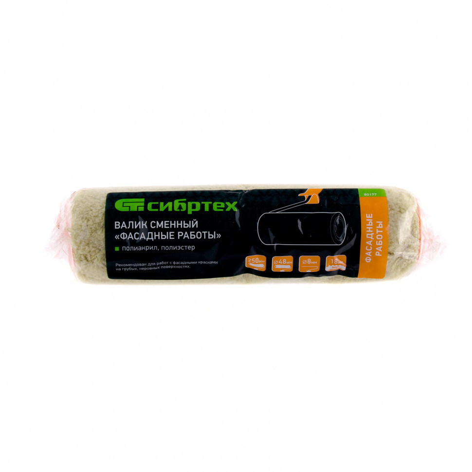 Сменный валик Сибртех «Фасадные работы» 80177 с ворсом 18 мм из полиакрила и полиэстера, роликом 250 х 48 мм, предназначен для установки на ручку диаметром 8 мм. Его используют при проведении фасадных работ для нанесения ЛКМ на грубые участки с неровностями.