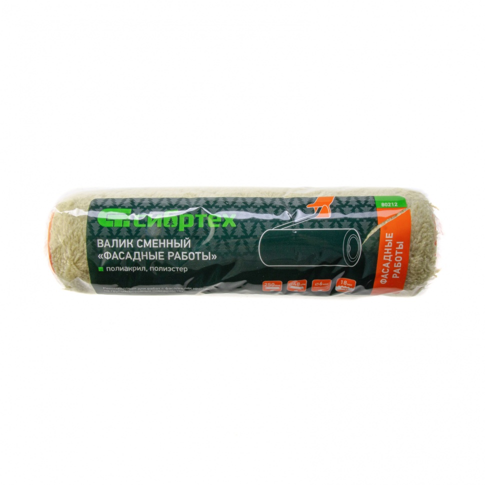 Сменный валик Сибртех «Фасадные работы» 80212 с ворсом 18 мм из полиакрила и полиэстера, роликом 250 х 48 мм, предназначен для установки на ручку диаметром 6 мм. Его используют при проведении фасадных работ для нанесения ЛКМ на грубые участки с неровностями.