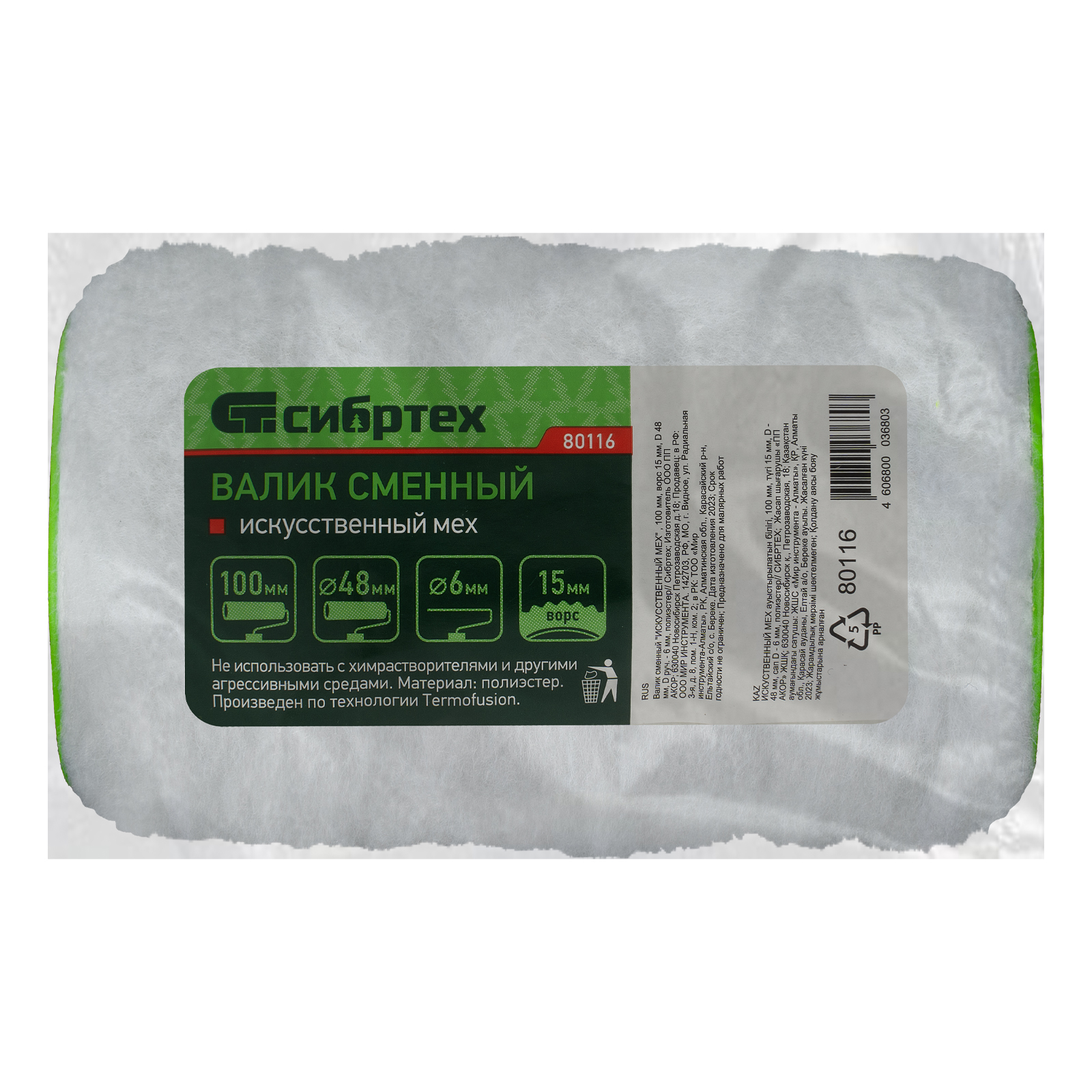 Сменный валик Сибртех «ИСКУССТВЕННЫЙ МЕХ» 80116 с ворсом из полиэстера 15 мм, шириной 100 мм и диаметром 48 мм, устанавливается на ручки диаметром 6 мм. Применяется для нанесения эмалей, масляных красок и защитных покрытий при проведении подготовительных и общих малярных работ. Ворс длиной 15 мм идеально подходит для окрашивания средне-гладких и шероховатых поверхностей. Изделие совместимо с валиком Сибртех 80111 и другими моделями аналогичного размера.
