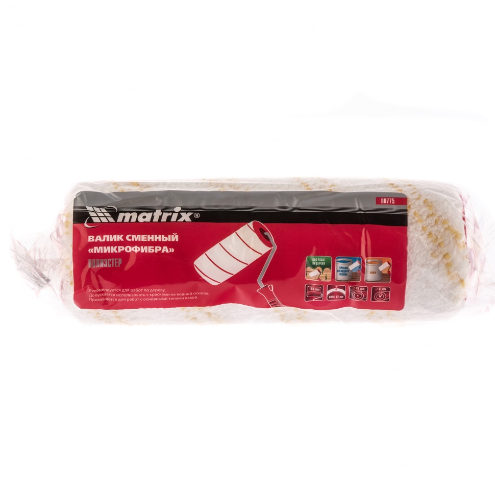 Сменный валик Matrix «МИКРОФИБРА» 80775 размером 180 х 48 мм, с ворсом 12 мм из полиэстера, для бюгеля 8 мм, используется во время подготовительных и малярных работ с жидкими, невязкими материалами: пропитками, лазурью, грунтовками, дисперсионными красками, антисептиками и т.д. Он применяется для окрашивания стен, потолков, деревянных поверхностей с гладкой и шероховатой фактурой, обеспечивает равномерное покрытие без брызг и следов ворса.