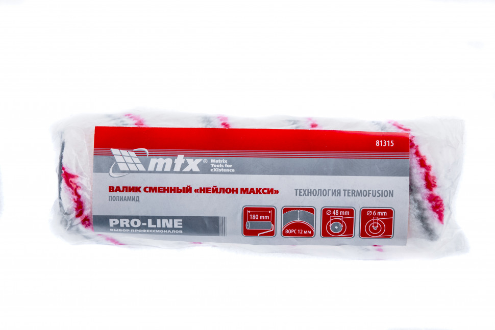 Сменный валик MTX PRO LINE 81315 «НЕЙЛОН МАКСИ» шириной 180 мм, шубкой из полиамида с ворсом 12 мм, диаметром ролика 48 мм, устанавливается на бюгель 6 мм. Валик из полиамида предназначен для нанесения всех видов красок на водно-дисперсионной основе и основах, содержащих растворители. Этот материал хорошо впитывает и отдает краску. Он легко чистится, не требует специального ухода, устойчив к износу и агрессивным составляющим красящих веществ. Тонкая нитяная структура волокон позволяет добиться наилучших результатов. За счет длины ворса 12 мм валик равномерно окрашивает как гладкие, так и рельефные, шершавые поверхности.