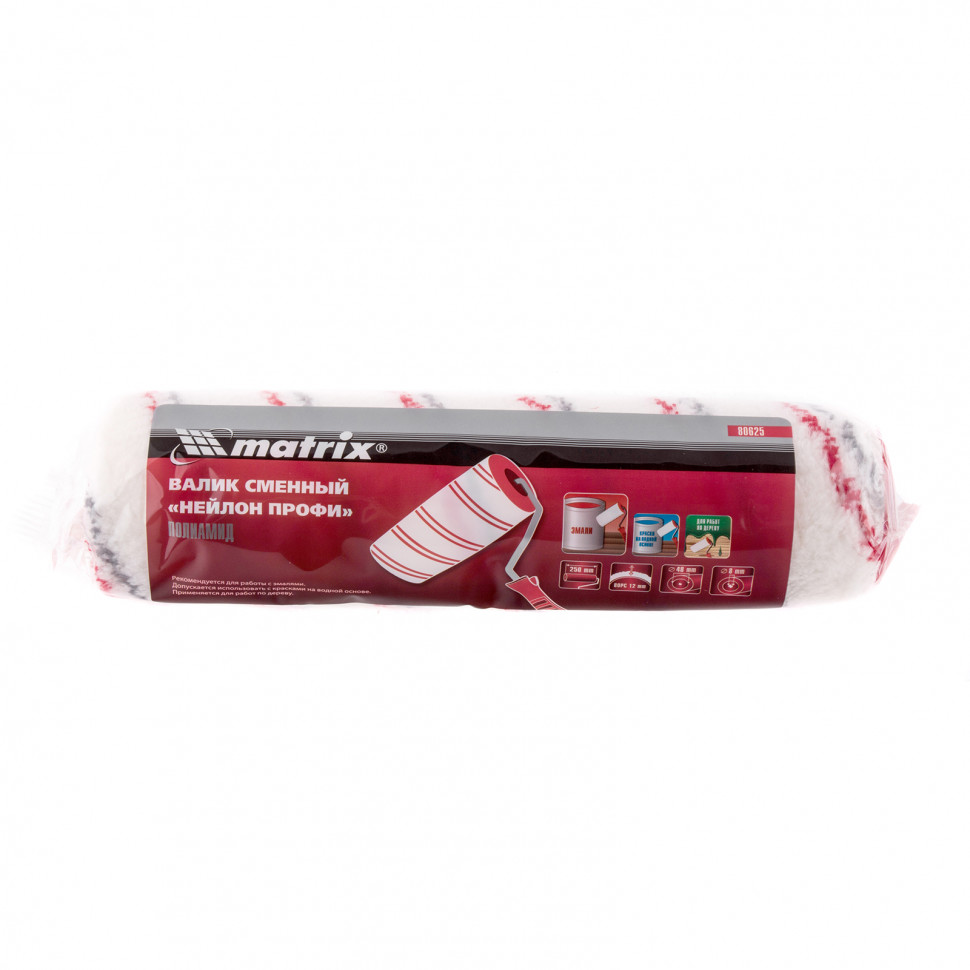 Сменный валик Matrix 80625 «Нейлон Профи» с полиамидным ворсом длиной 12 мм и диаметром ролика 48 мм подходит к ручкам диаметром 8 мм. Он предназначен для нанесения любых типов лакокрасочных материалов на поверхности с гладкой текстурой и небольшим рельефом. Ширина 250 мм позволяет эффективно и быстро окрашивать большие площади: стены, потолки, фасады и т.д. Высокое качество работ обеспечивает полиамидная шубка с длиной ворса 12 мм.