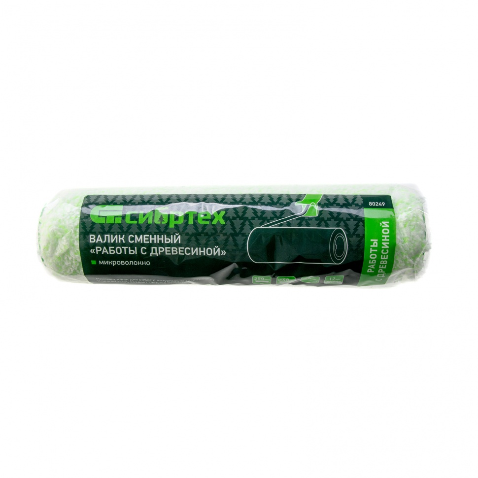 Сменный валик Сибртех «Работы с древесиной» 80249 шириной 250 мм, с ворсом 12 мм из микроволокна, диаметром 48 мм, подходит под ручку 6 мм. Он равномерно наносит на деревянный поверхности жидкие ЛКМ: антисептики, грунтовки, пропитки, защитные составы, лазурь и другие невязкие материалы. За счет ширины 250 мм валик оптимален для окрашивания больших поверхностей.