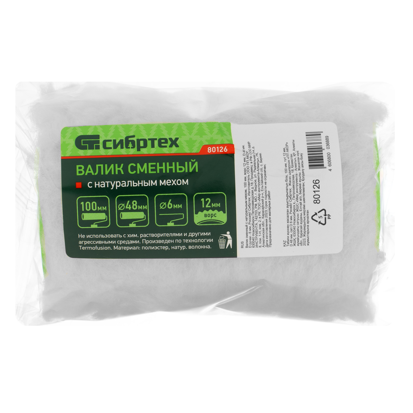 Сменный валик с натуральным мехом Сибртех 80126 100 х 48 мм, под ручку 6 мм, с ворсом 12 мм, предназначен для малярных работ. Применяется для нанесения эмалевых, масляных, водно-дисперсионных красок и защитных покрытий. Длина ворса 12 мм делает валик универсальным и позволяет применять его на большинстве поверхностей. Валик подходит к модели Сибртех 80121 и другим изделиям с соответствующим размером рукоятки.