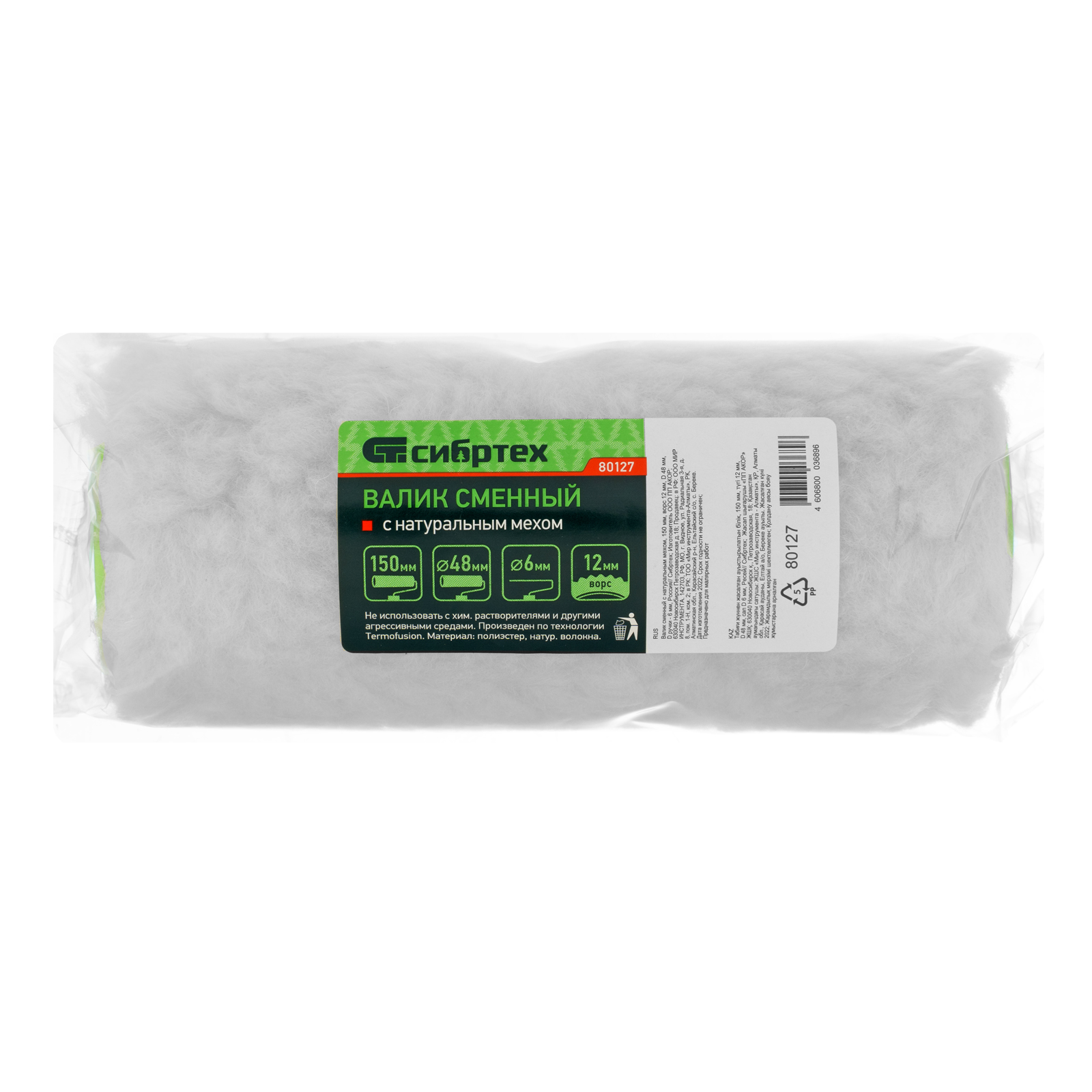 Сменный валик с натуральным мехом Сибртех 80127 шириной 150 мм и диаметром 48 мм, под ручку 6 мм, с ворсом 12 мм, предназначен для малярных работ. Применяется для нанесения эмалевых, масляных, водно-дисперсионных красок и защитных покрытий. Длина ворса 12 мм делает валик универсальным и позволяет применять его на большинстве поверхностей. Валик подходит к модели Сибртех 80122 и другим изделиям с соответствующим размером рукоятки.
