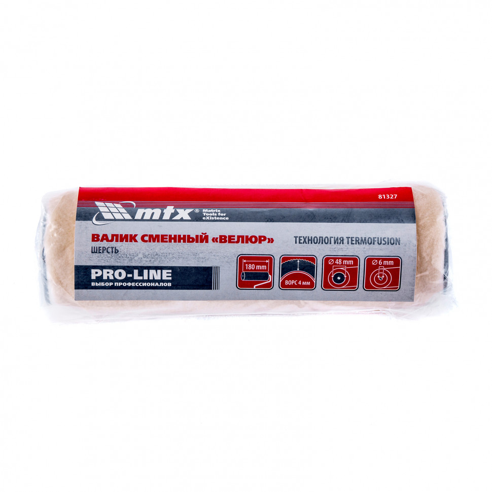 Сменный валик MTX PRO «ВЕЛЮР» 81327 с ворсом 4 мм из шерсти 50% и полиакрила 50%, шириной ролика 180 мм и диаметром 48 мм, устанавливается на бюгель 6 мм. Используется при лакировании полов и гладкой древесины. Коротковорсовая шубка подходит для нанесения финишного покрытия и оптимальна для работы с алкидными и эпоксидными лаками, а также защитными составами на основе растворителей.