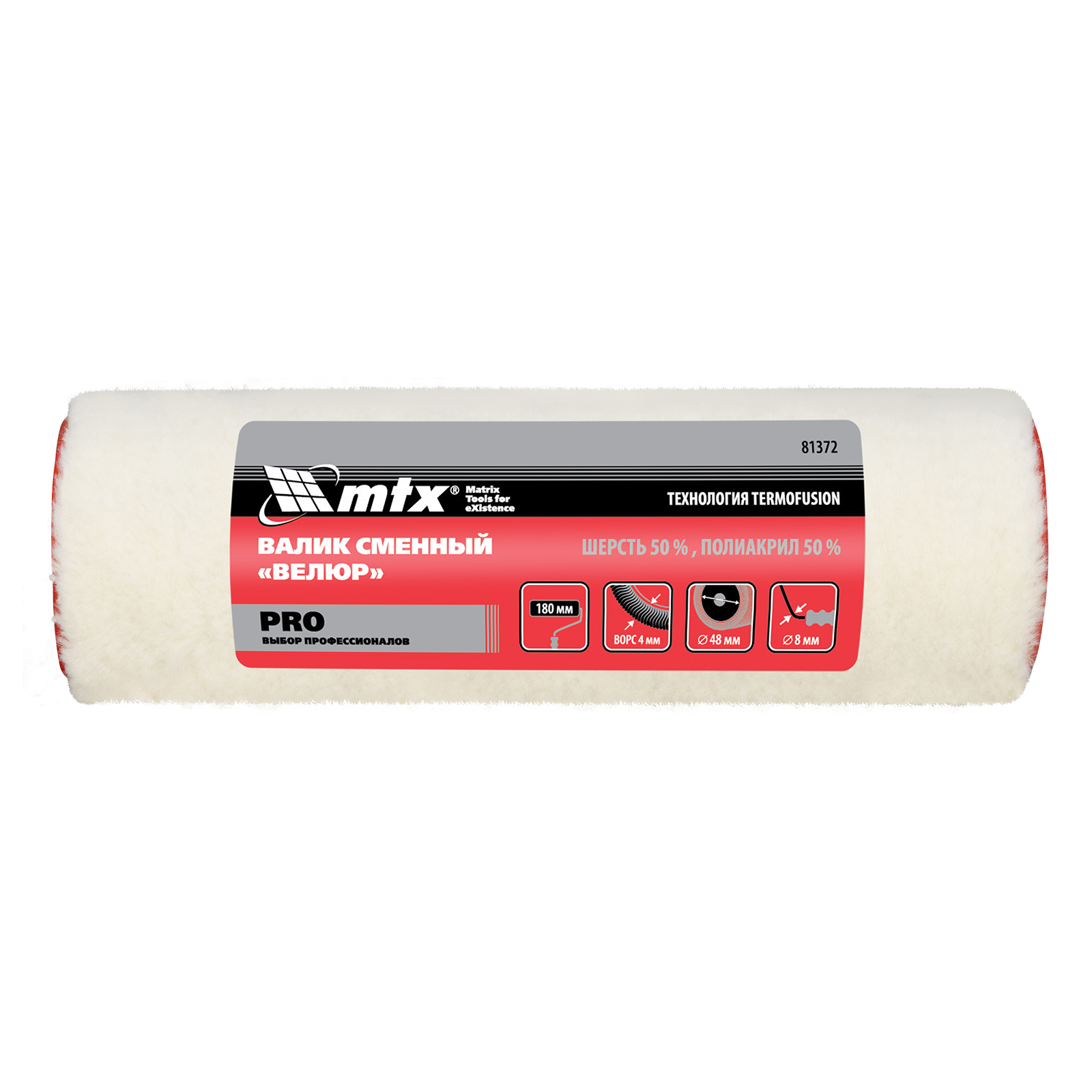 Сменный валик MTX PRO «ВЕЛЮР» 81372 с ворсом 4 мм из шерсти 50% и полиакрила 50%, шириной ролика 180 мм и диаметром 48 мм, устанавливается на бюгель 8 мм. Используется при лакировании полов и гладкой древесины. Коротковорсовая шубка подходит для нанесения финишного покрытия и оптимальна для работы с алкидными и эпоксидными лаками, а также защитными составами на основе растворителей.