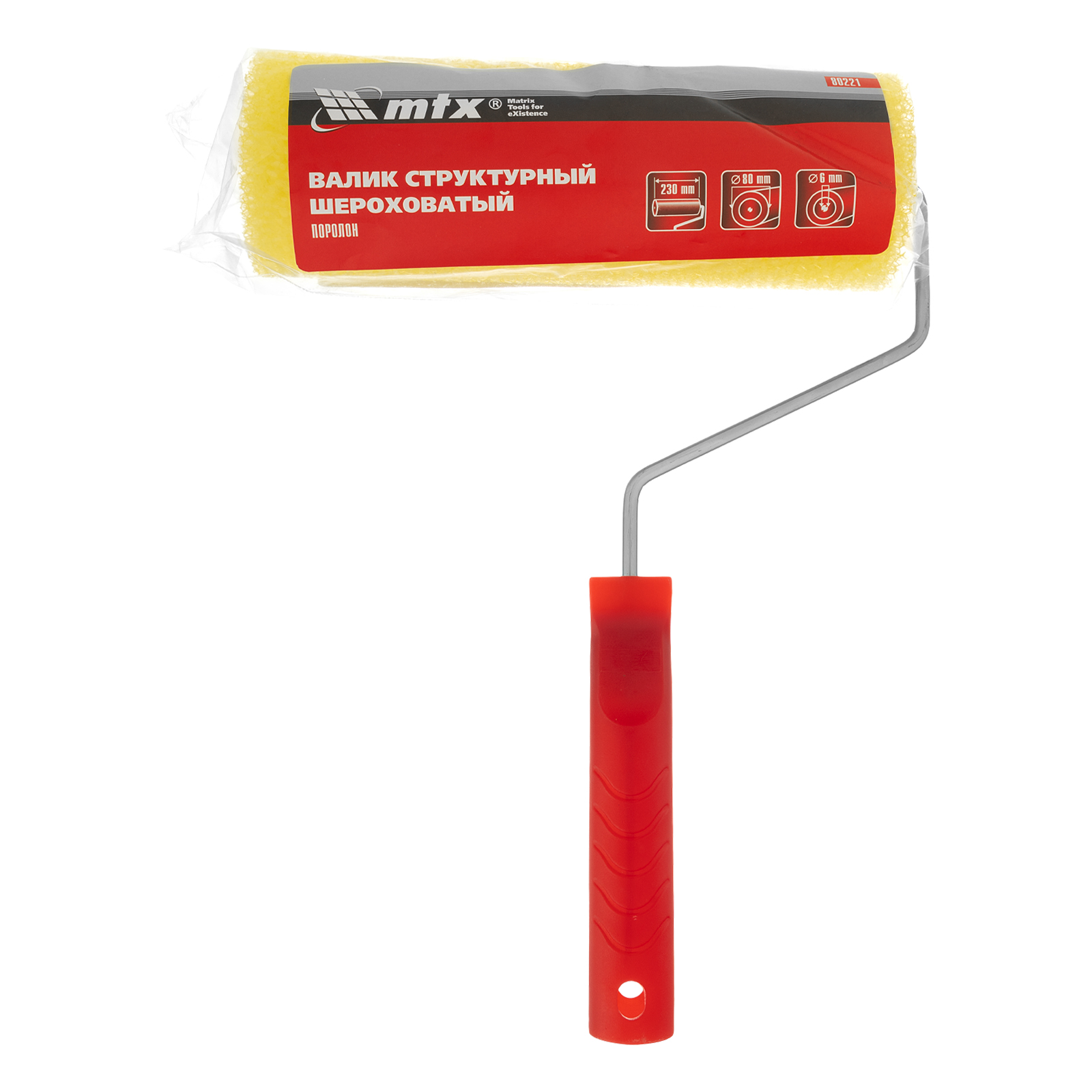 Структурный поролоновый валик MTX 80221 «шероховатый» 230 мм с ручкой диаметром 6 мм, диаметром ролика 80 мм, предназначен для декоративной отделки стен, потолков, фасадов и других поверхностей. Он подходит для нанесения водно-дисперсионных фактурных красок, декоративной штукатурки, жидких материалов без содержания химических растворителей и щелочи. Небольшие отверстия в поролоновой шубке позволяют создать оригинальный узор на поверхности. Валик прост в применении и не требует владения профессиональными навыками.