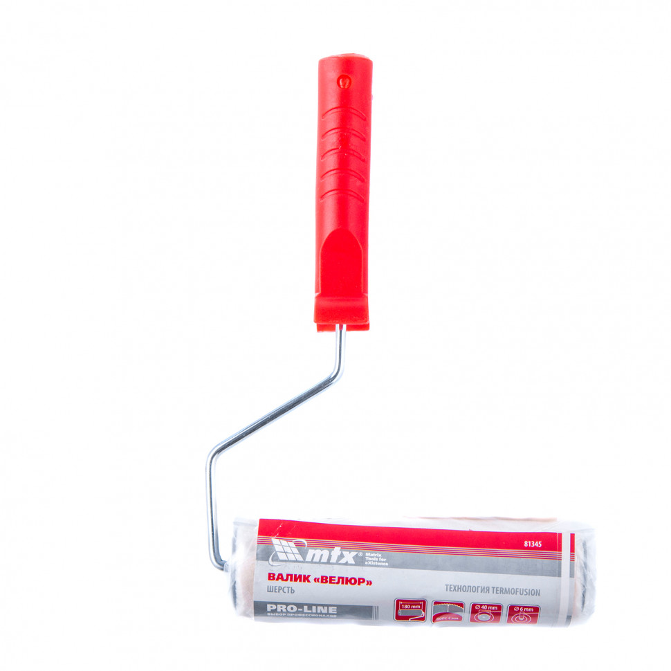 Валик MTX PRO «ВЕЛЮР» 81345 шириной 180 мм, с ворсом 4 мм из шерсти 50% и полиакрила 50%, диаметром ролика 40 мм и ручкой 6 мм, используется для выполнения финишной отделки. Благодаря короткому ворсу лакокрасочный состав распределяется тонким слоем. Валик оптимален для работы с алкидными и эпоксидными лаками, но подходит также для нанесения тонким слоем других материалов, например, защитных составов на основе растворителей.