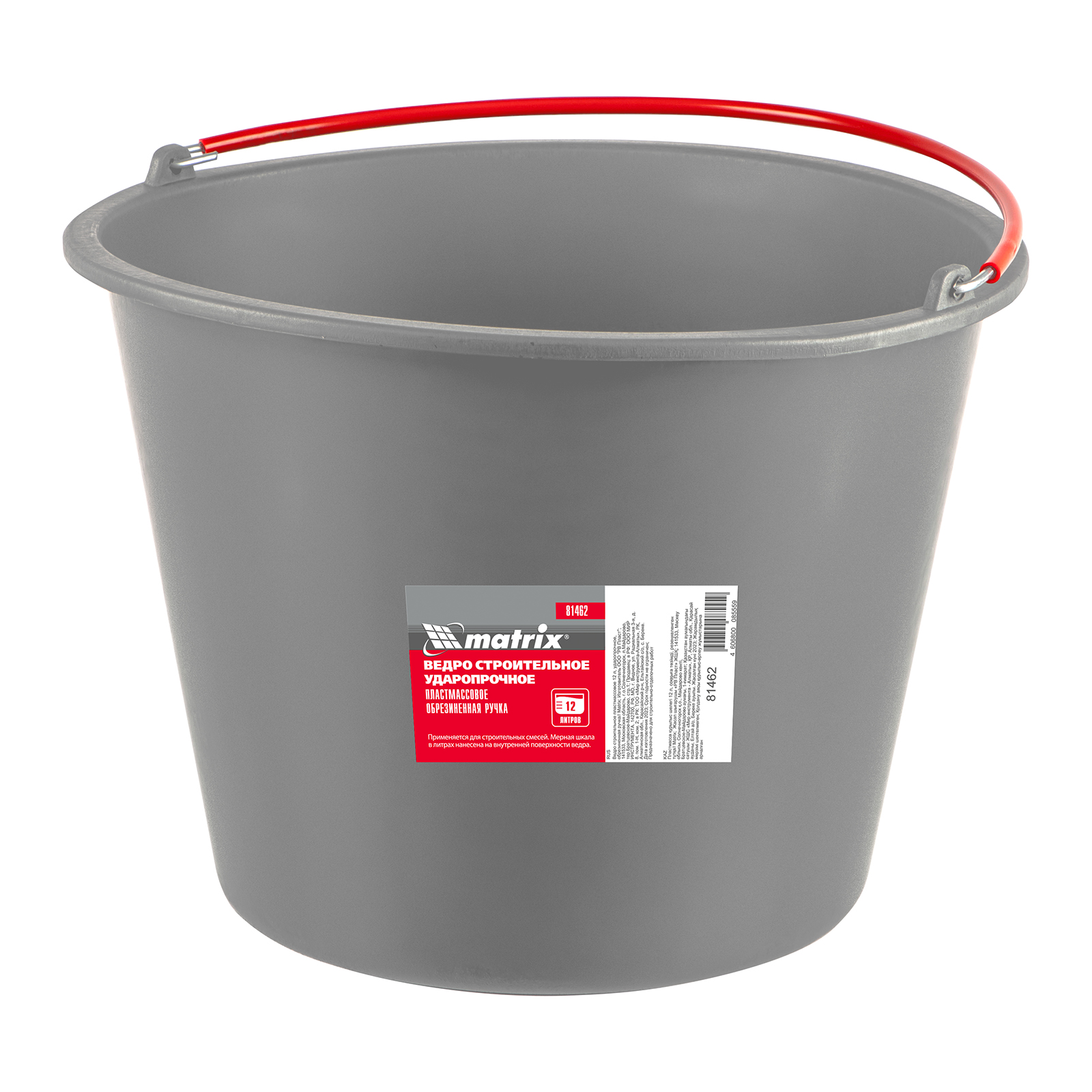 Ударопрочное пластмассовое ведро Matrix 81462 объемом 12 л, с обрезиненной рукояткой, используется во время проведения строительных и отделочных работ. В нем можно замешивать строительные растворы, хранить и перемещать жидкие и сыпучие материалы. На внутренней поверхности имеется шкала, позволяющая отмерять необходимое количество раствора.