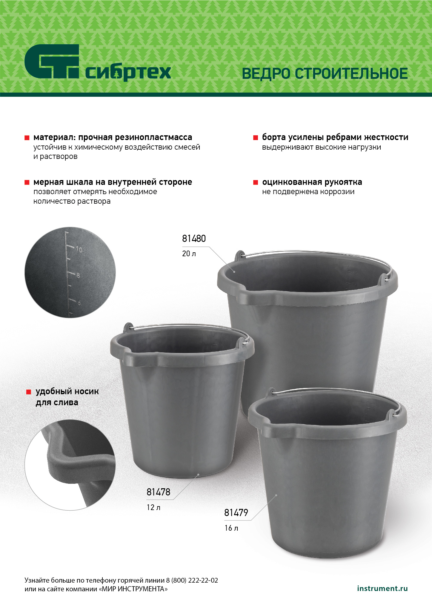 Ведро строительное пластмассовое Сибртех 81480 объемом 20 л, высокопрочное, с носиком, используется при проведении строительных и отделочных работ. В нем можно замешивать строительные растворы, хранить и переносить жидкие и сыпучие материалы.