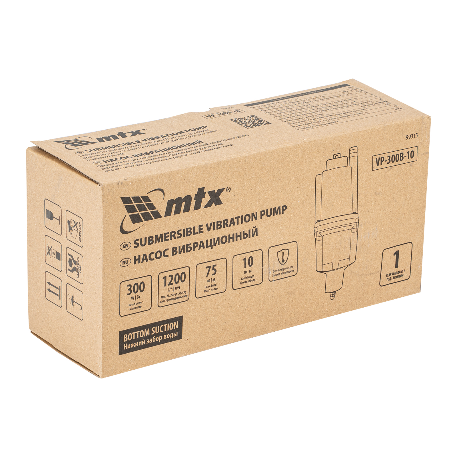 Вибрационный насос MTX VP-300B-10 99315 мощностью 300 Вт и производительностью 1200 л/ч, с кабелем длиной 10 м, обеспечивает напор до 75 м. Предназначен для перекачивания чистой воды из колодцев и открытых водоемов, осушения бассейнов и емкостей, забора воды из резервуаров для полива. Конструкция с нижним забором жидкости позволяет откачивать воду до минимального уровня. Высокопроизводительный насос позволяет организовать эффективную систему водоснабжения и орошения на дачном участке.