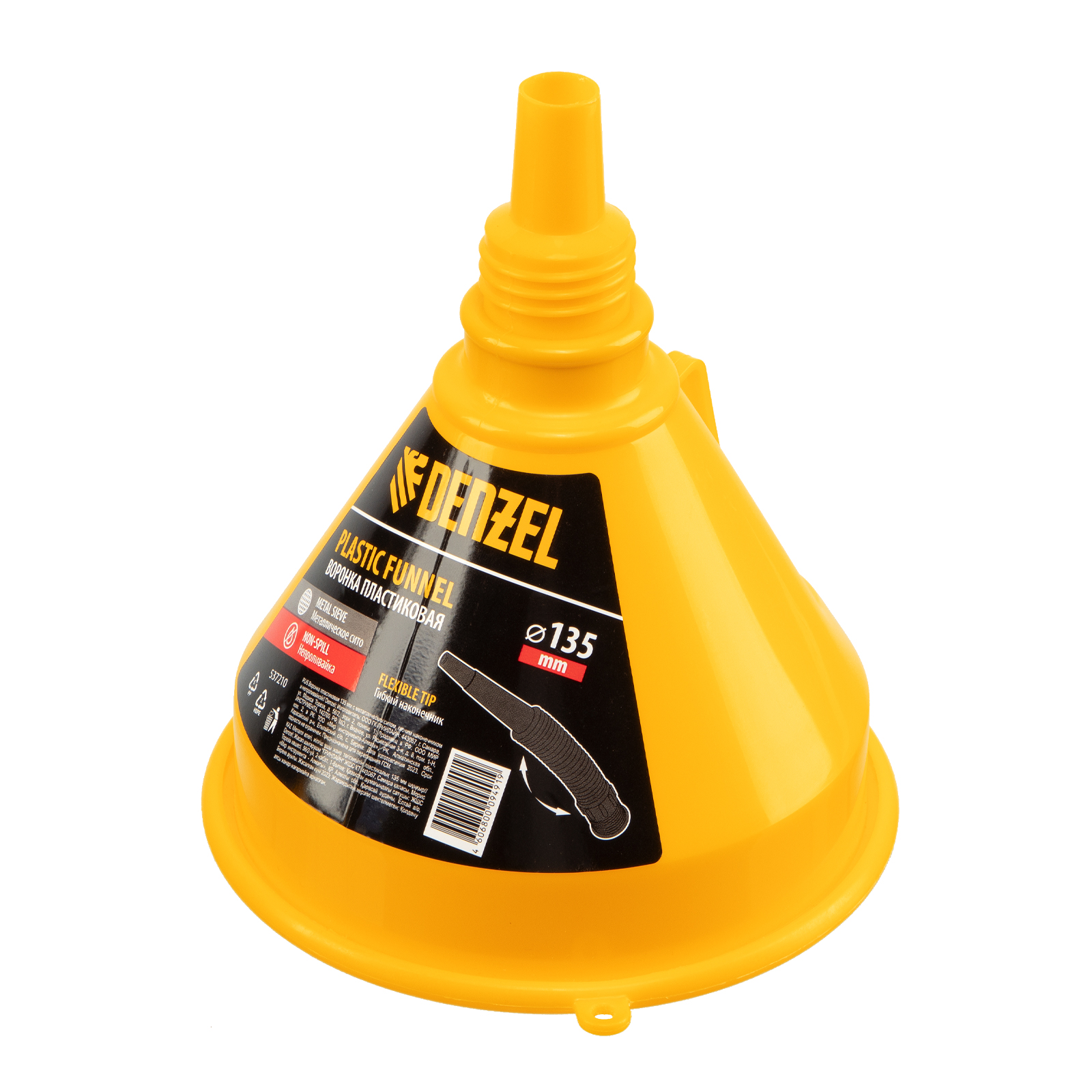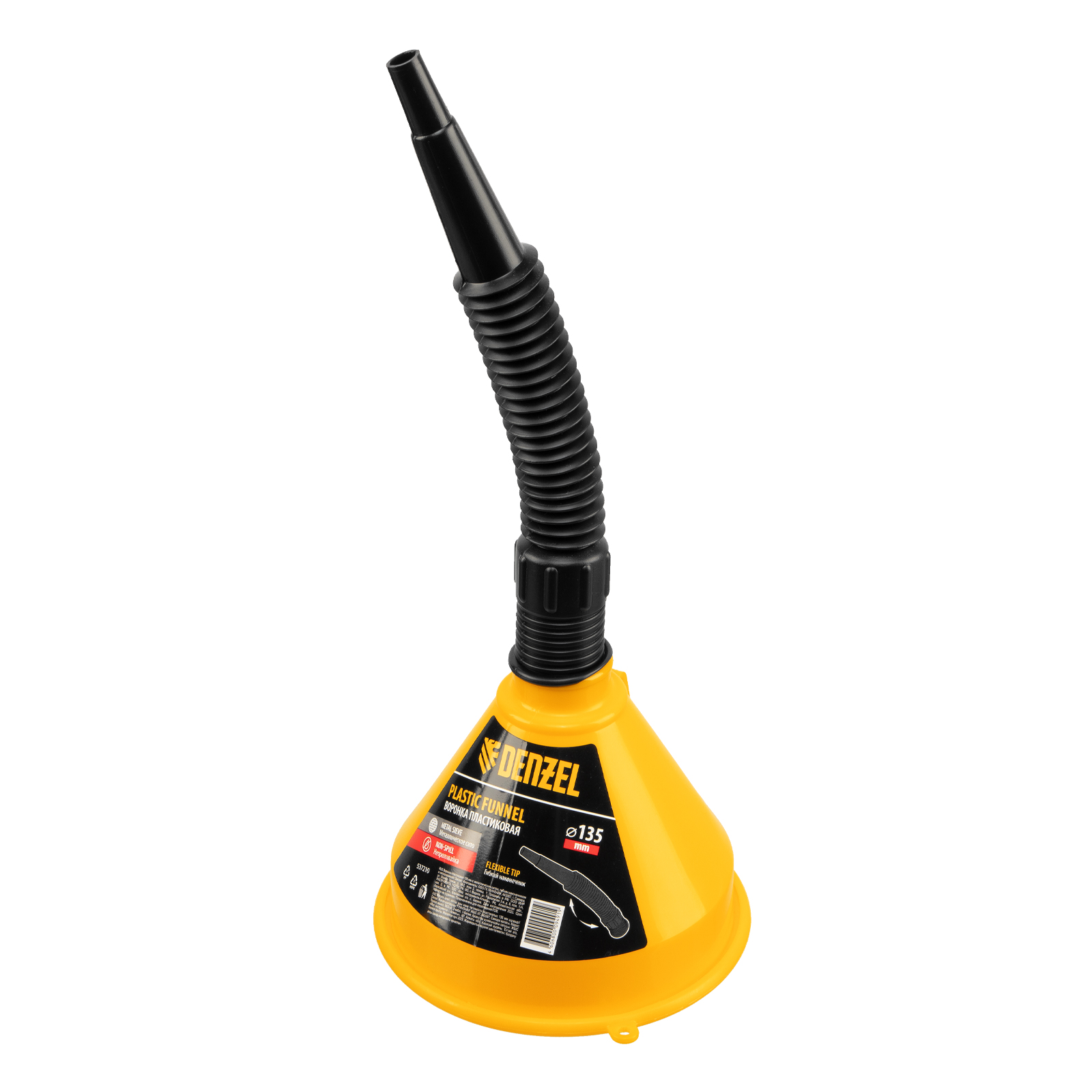 Пластиковая воронка Denzel 537210 диаметром 135 мм, с металлическим сетчатым фильтром, «непроливайкой» и гибким наконечником, позволяет переливать топливо, антифриз, масло и другие горюче-смазочные материалы. Будет полезна автовладельцам: с ее помощью процедура происходит гораздо быстрее и без риска испачкаться. Воронка выполнена из маслобензостойкого материала.