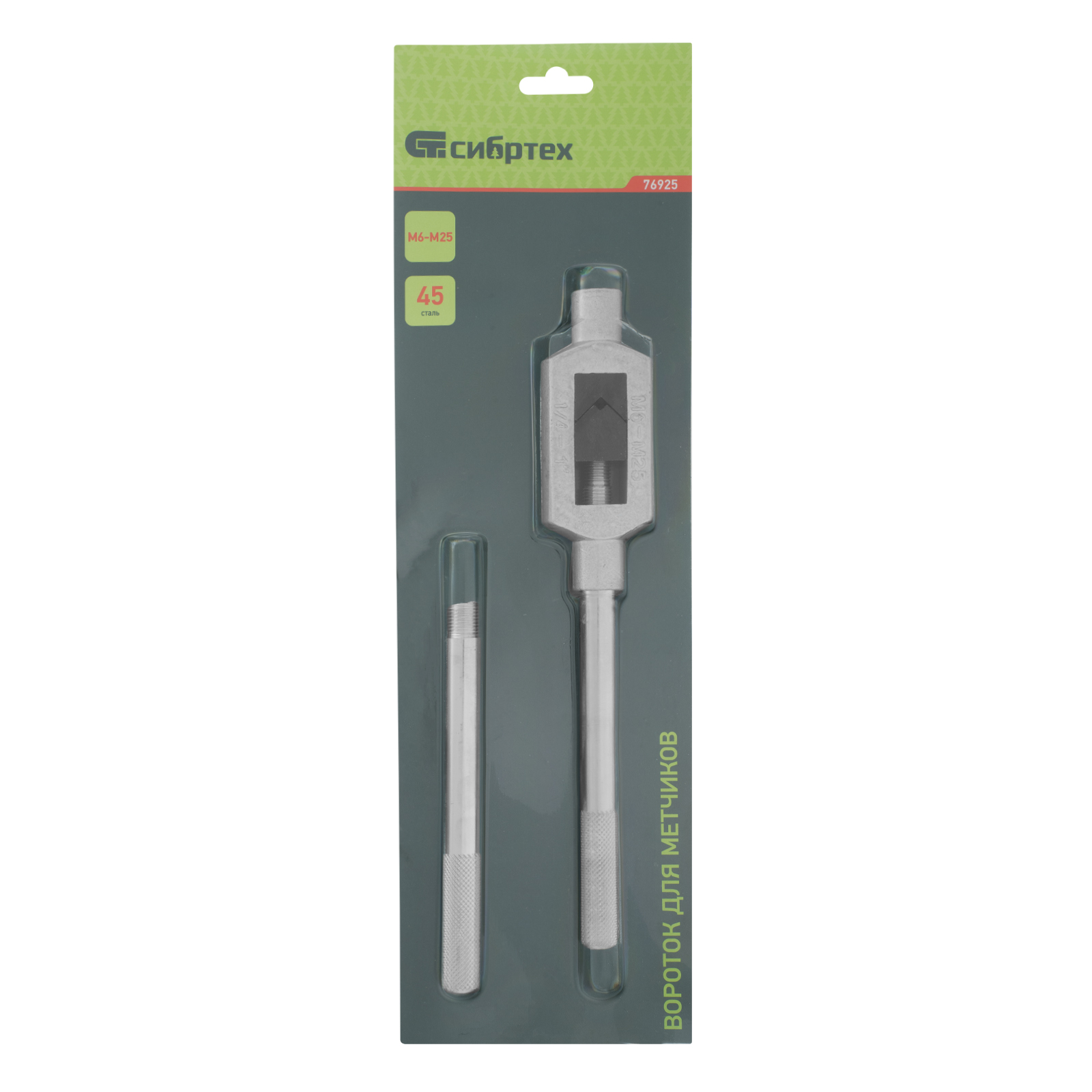 Вороток Сибртех 76925 подходит для зажима метчиков, используемых для ручного нарезания внутренней резьбы М6-М25 в отверстиях и цилиндрических деталях. Применяется во время ремонта резьбовых соединений, пригодится в мастерской или гараже.