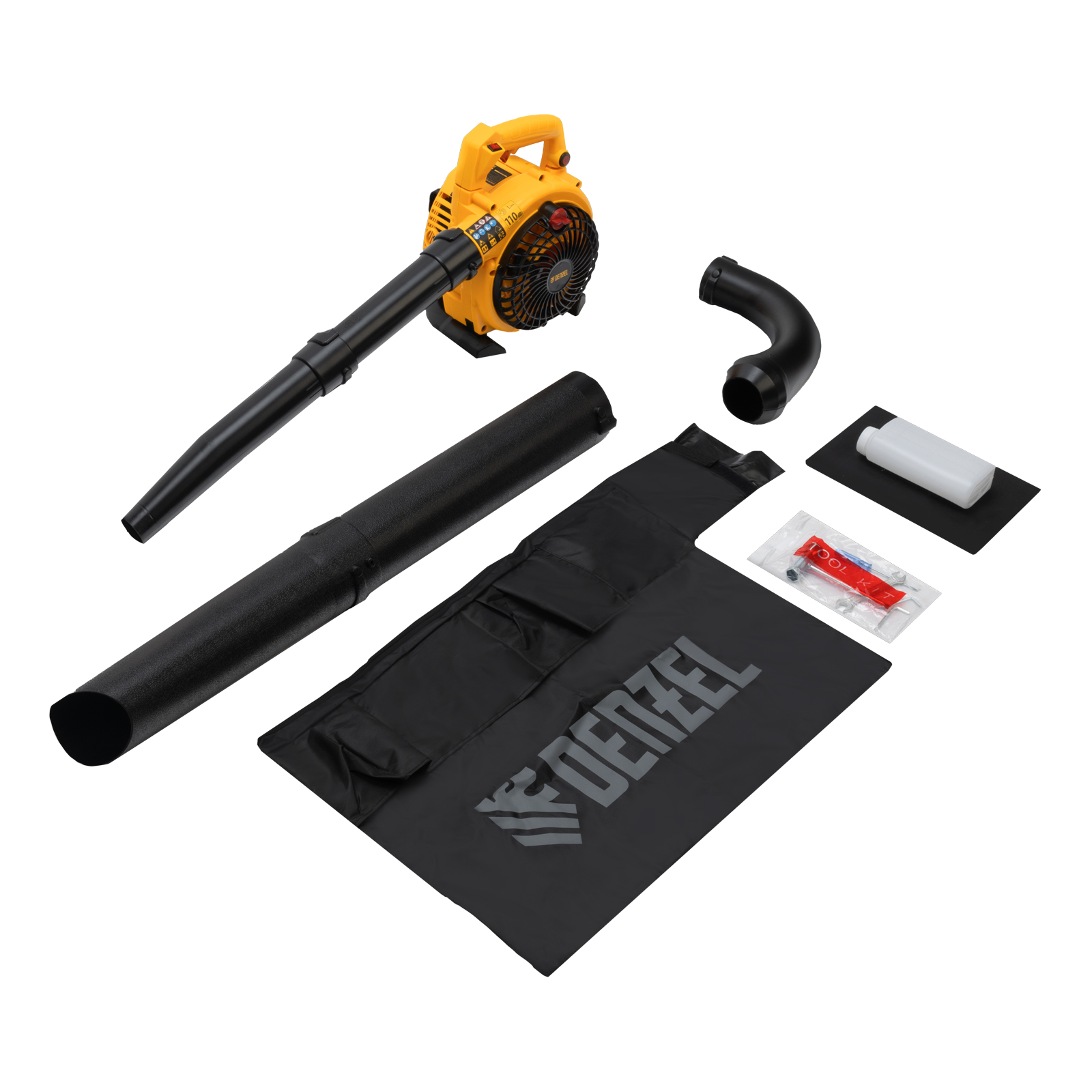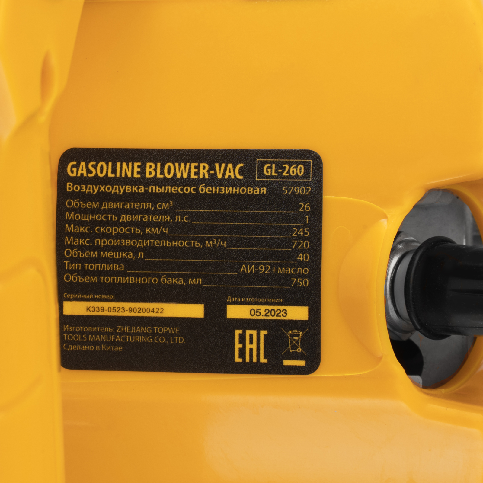 Бензиновая воздуходувка-пылесос Denzel GL-260 57902 с двухтактным двигателем объемом 26 см³ и мощностью 1 л.с. предназначена для очищения территории от листьев и скошенной травы. Скорость потока воздуха 245 км/ч обеспечивает высокую эффективность работы. Техника работает как в режиме обдува, так и всасывания: при этом мусор измельчается в мешок объемом 40 л, входящий в комплект поставки. Такое решение избавляет от необходимости вручную собирать листву и траву после уборки.