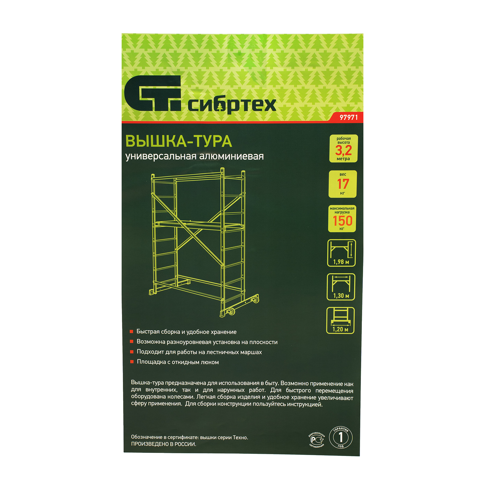 Вышка-тура 97971 используется для проведения строительных, ремонтных, отделочных и монтажных работ на высоте до 3,2 м. Грузоподъемность конструкции 150 кг — на площадке мастер может расположиться сам и разместить необходимые инструменты и материалы. Вышка быстро собирается и устанавливается, а благодаря колесам ее легко можно переместить в нужное место.