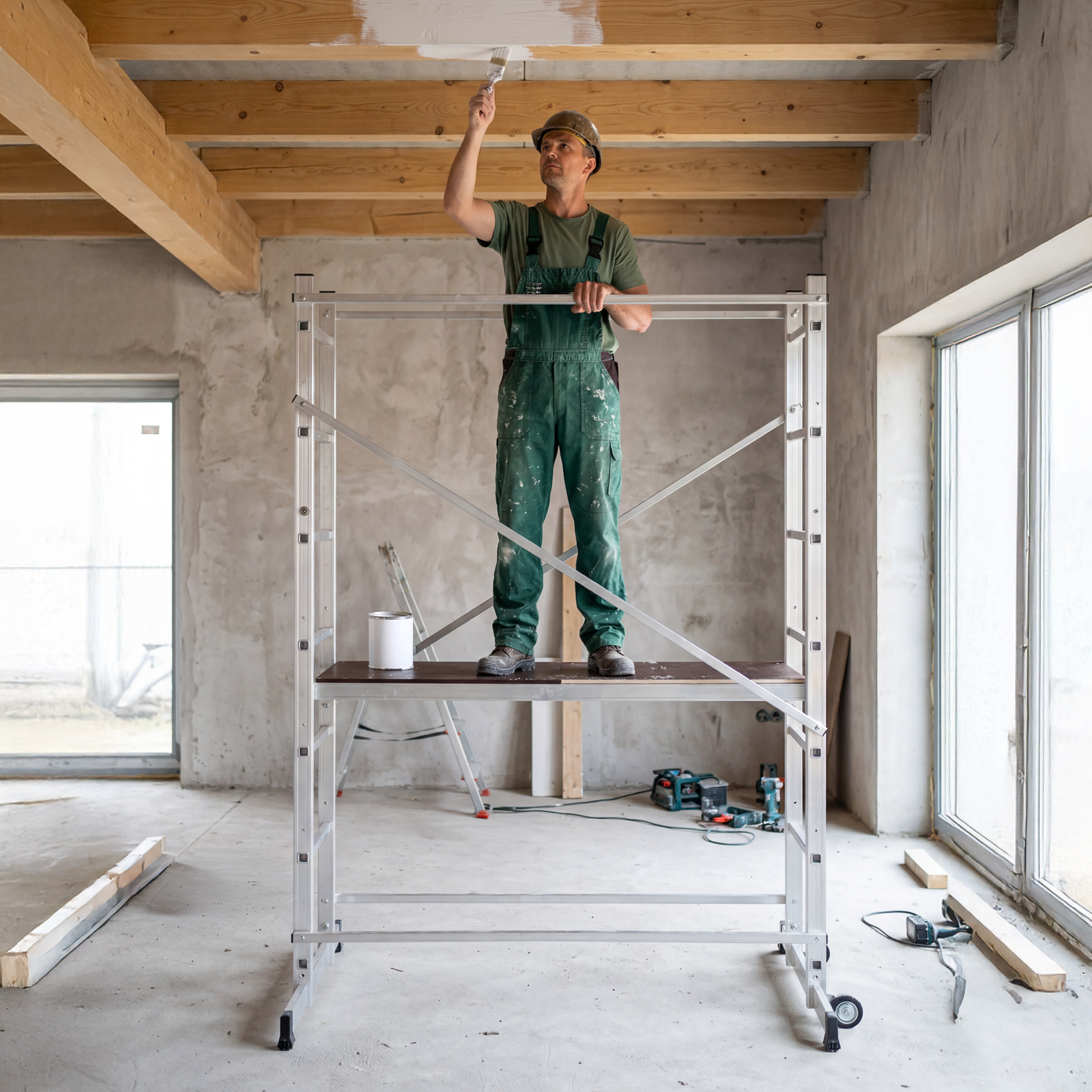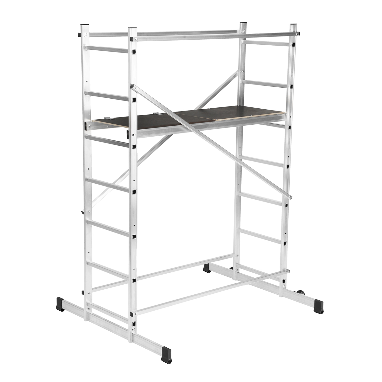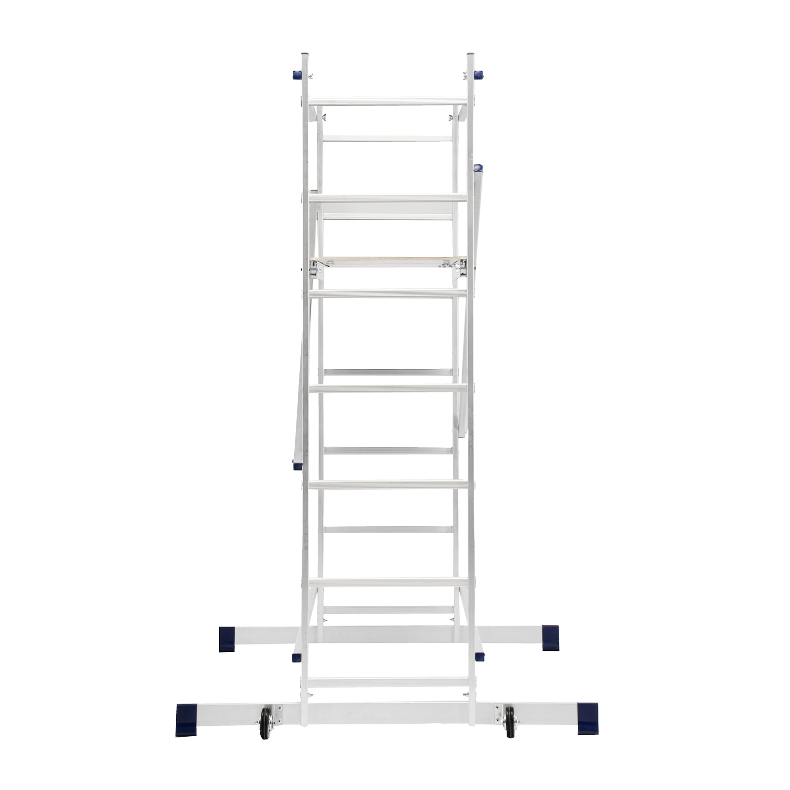 - Удобная работа на лестничных пролетах и наклонных поверхностях — помост можно фиксировать на разных уровнях стоек.