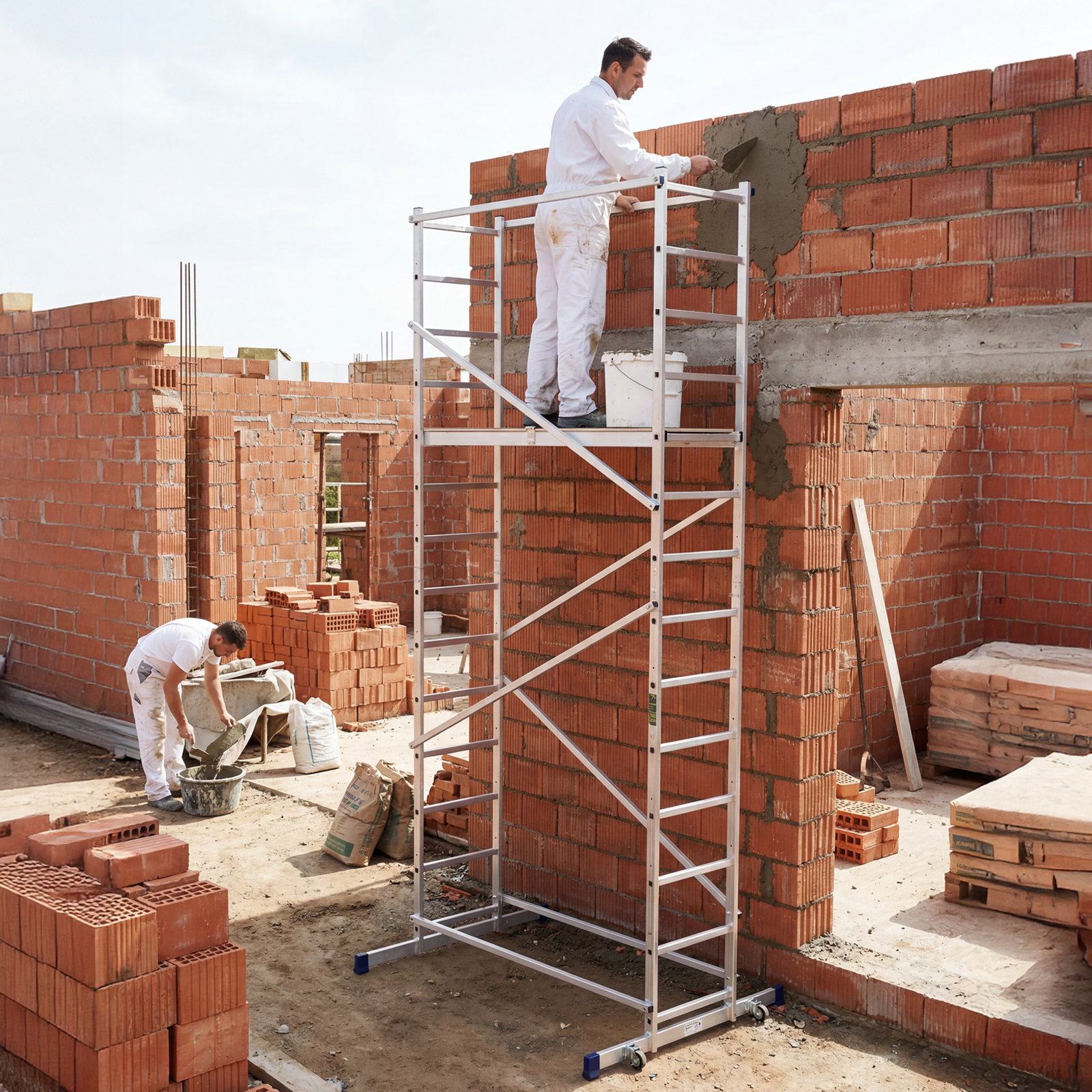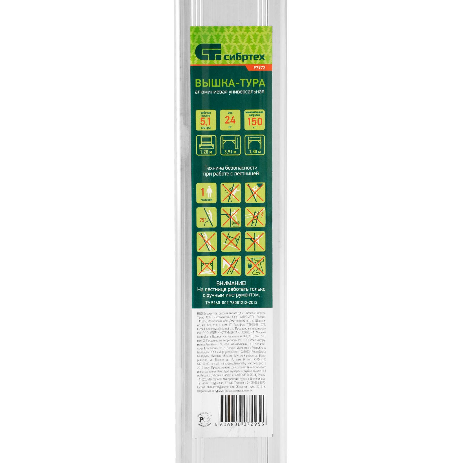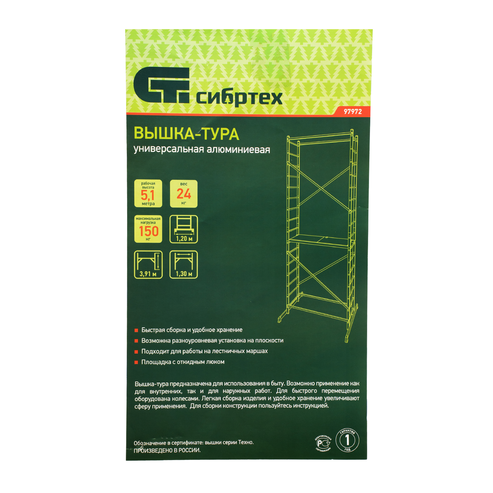 Вышка-тура 97972 используется для проведения строительных, ремонтных, отделочных и монтажных работ на высоте до 5,1 м. Грузоподъемность конструкции 150 кг — на площадке мастер может расположиться сам и разместить необходимые инструменты и материалы. Вышка быстро собирается и устанавливается, а благодаря колесам ее легко можно переместить в нужное место.