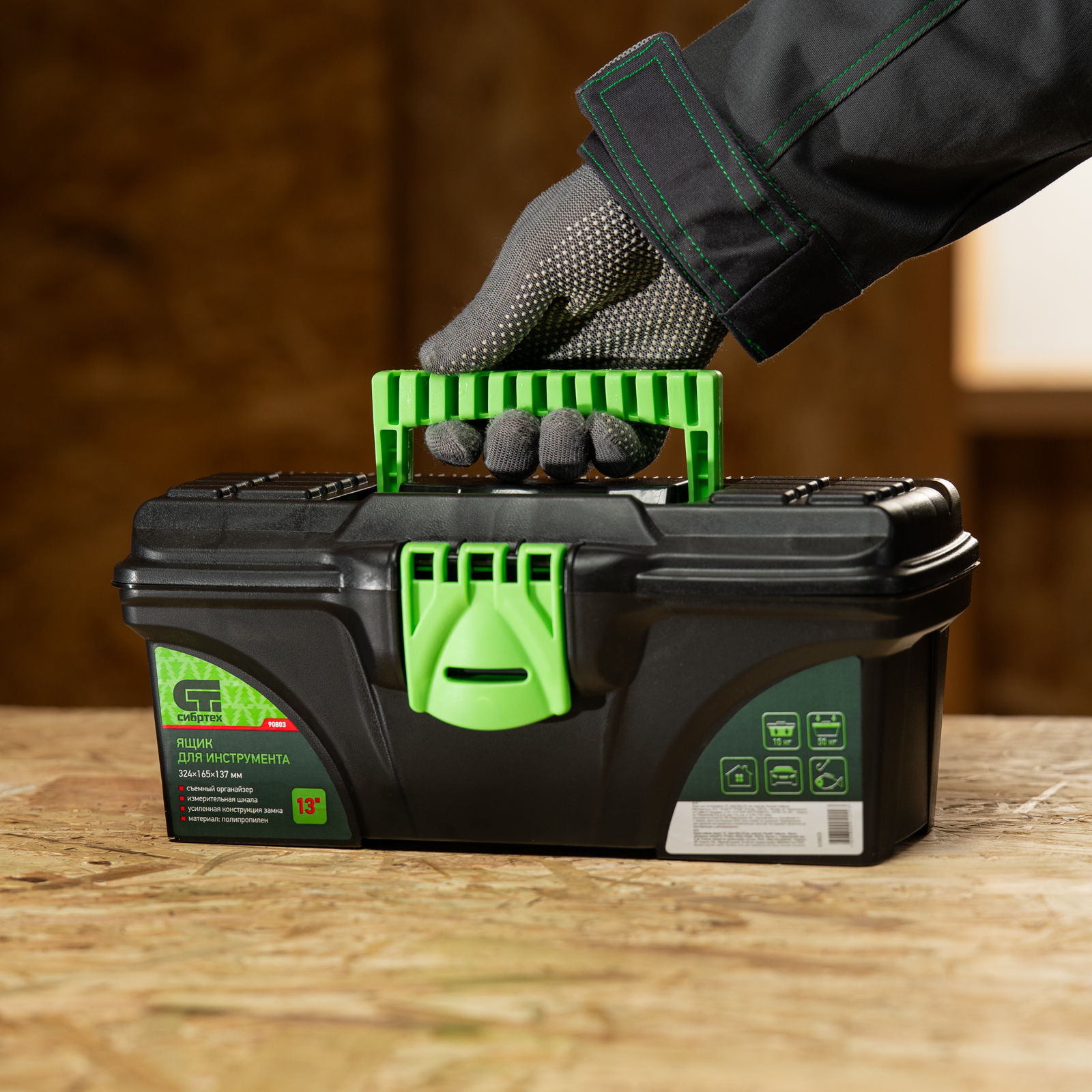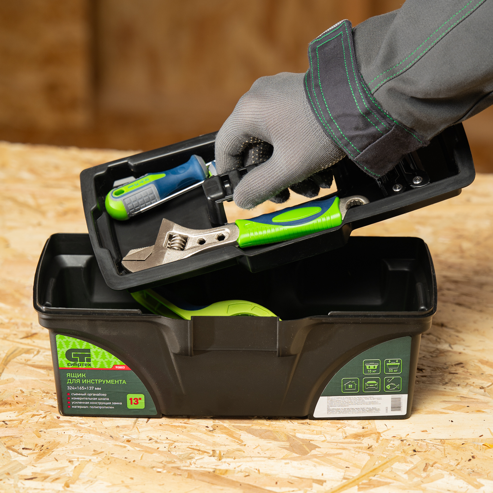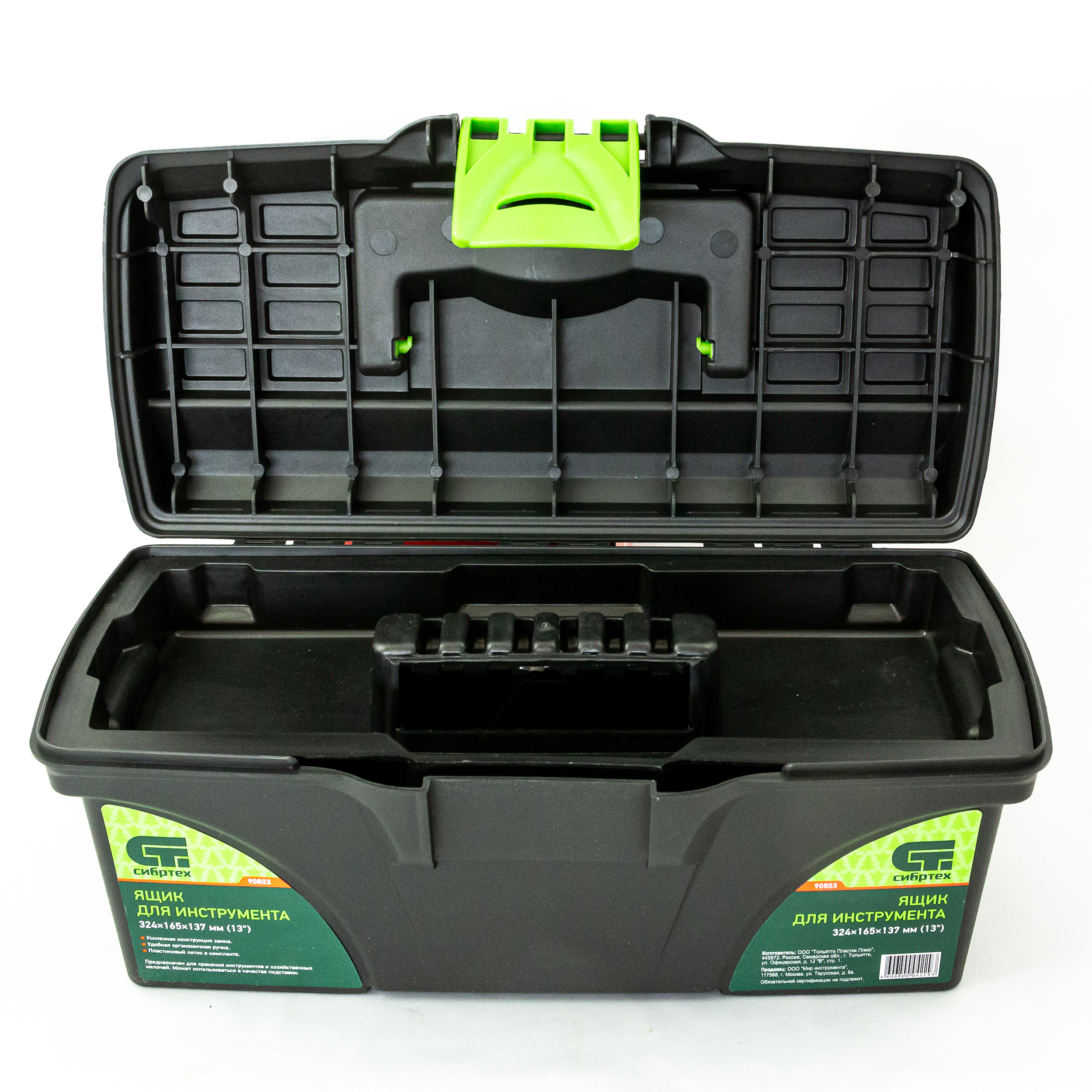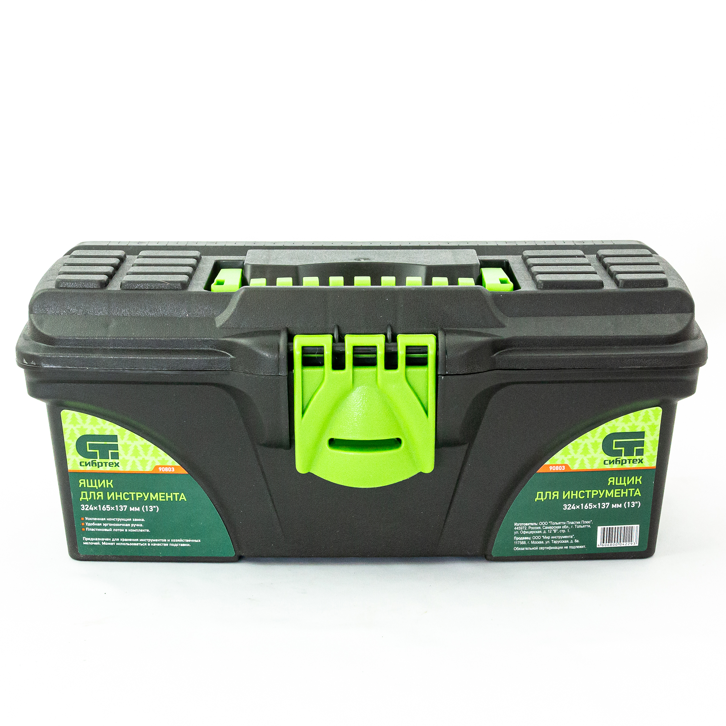 <p>Ящик для инструмента Сибртех 90803 из пластика, размером 324 х 165 х 137 мм (длина 13"), — удобное вместилище для инструментов, бытовых мелочей, рыболовных снастей. На крышку нанесена измерительная шкала в сантиметрах и дюймах, поэтому можно проводить измерения, даже если под рукой нет линейки. Ящик пригодится в поездке, на рыбалке, а также дома, на даче или в гараже.</p><h2>Преимущества</h2><ul><li>Усиленная конструкция — замок и верхняя крышка установлены на 3-рядные петли, поэтому ящик выдерживает значительный вес.</li><li>Рациональное использование внутреннего пространства — съемный лоток с ручкой удобен для хранения метизов и других мелких предметов.</li><li>Прочность — корпус, усиленный ребрами жесткости, устойчив к повреждениям в результате случайного удара или падения.</li><li>Удобное перемещение — на крышке имеется эргономичная ручка.</li></ul>