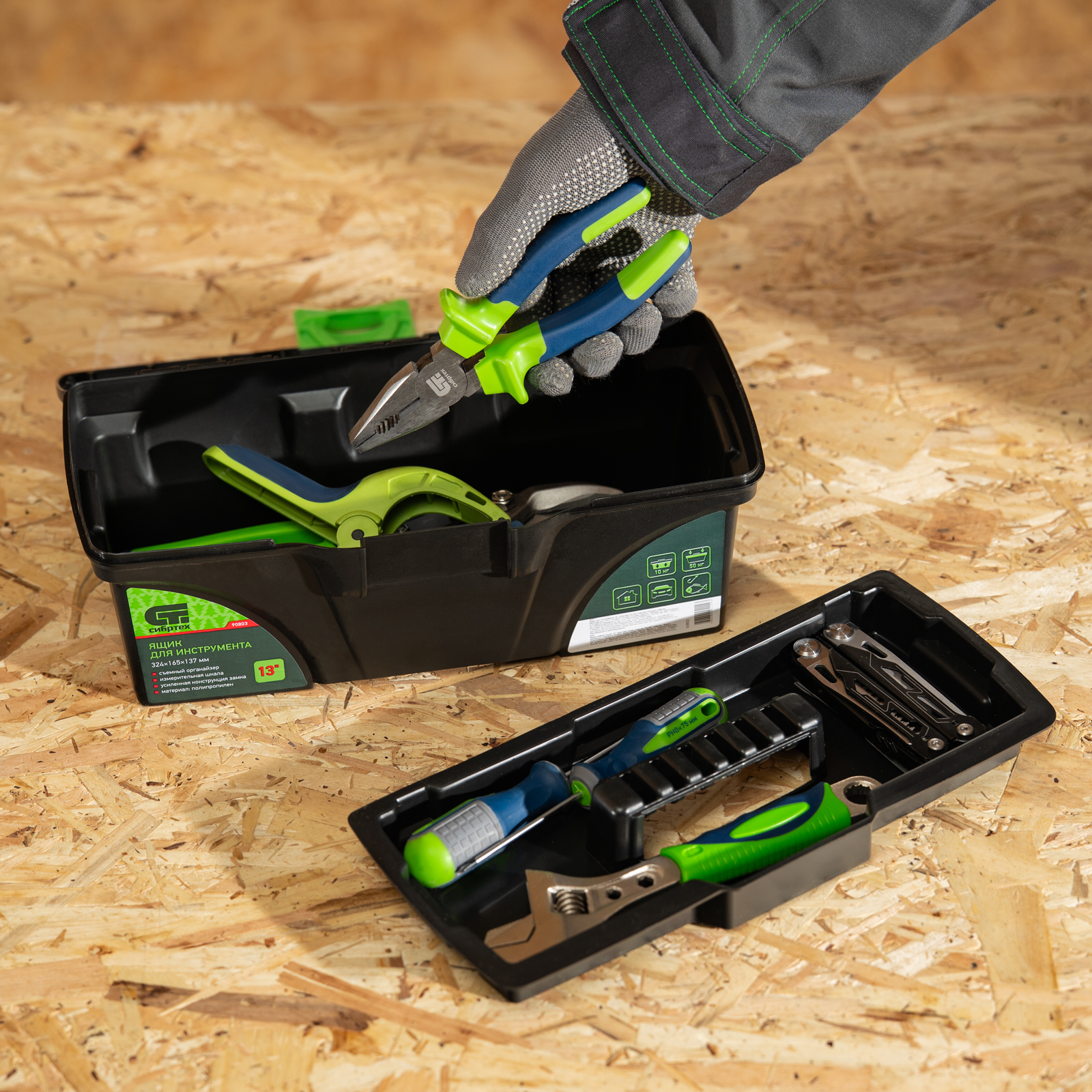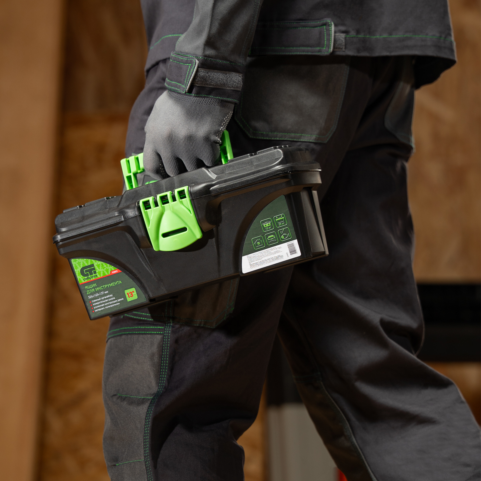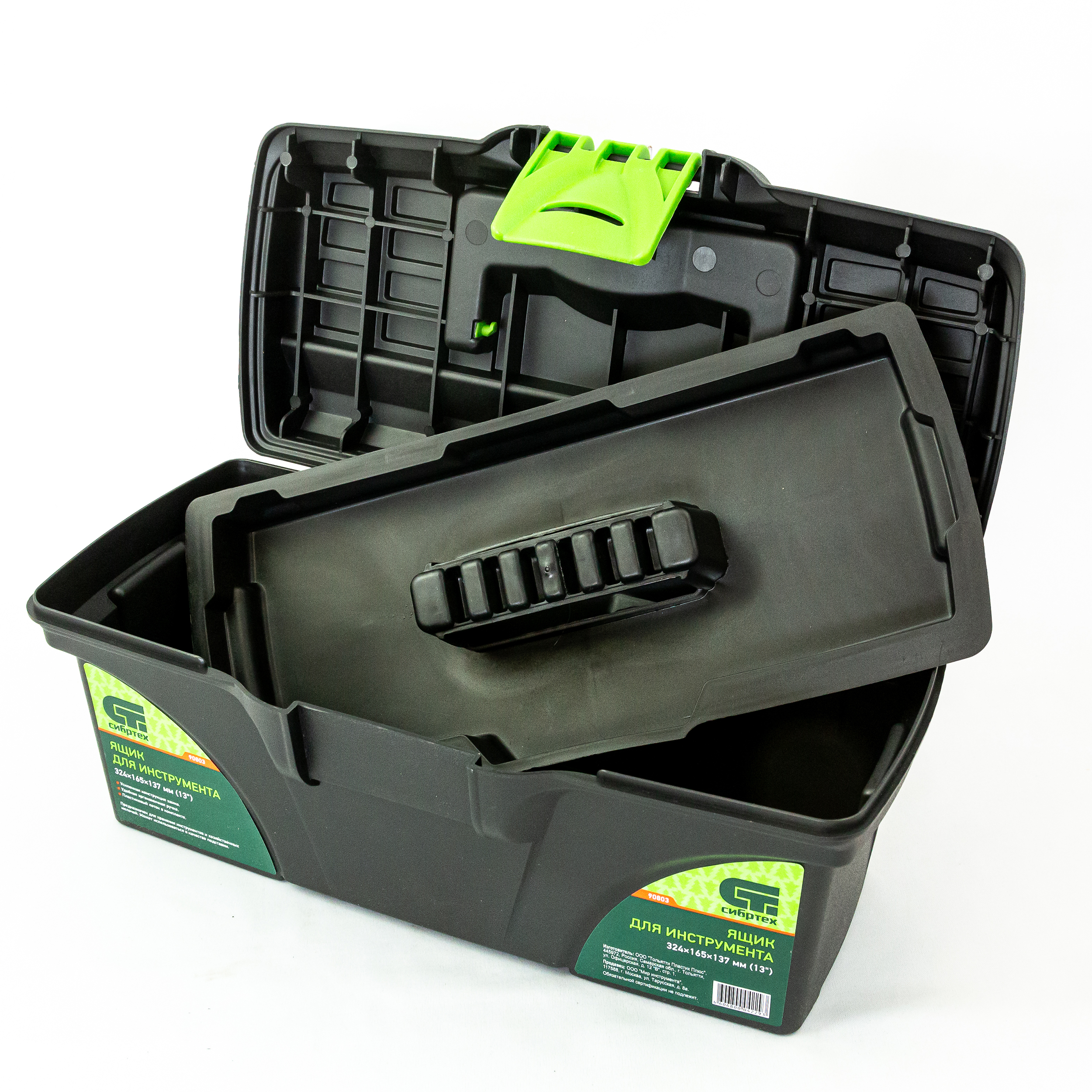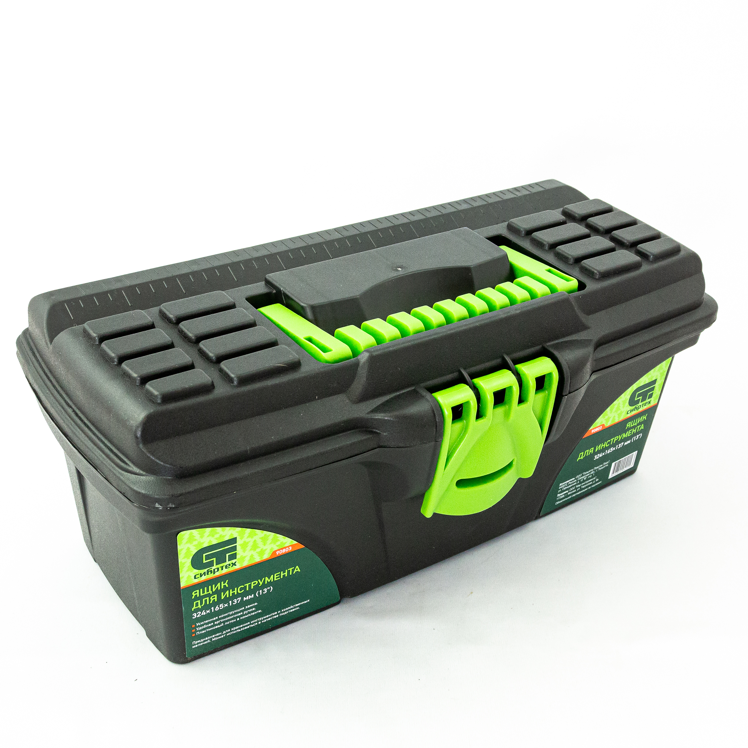 <p>Ящик для инструмента Сибртех 90803 из пластика, размером 324 х 165 х 137 мм (длина 13"), — удобное вместилище для инструментов, бытовых мелочей, рыболовных снастей. На крышку нанесена измерительная шкала в сантиметрах и дюймах, поэтому можно проводить измерения, даже если под рукой нет линейки. Ящик пригодится в поездке, на рыбалке, а также дома, на даче или в гараже.</p><h2>Преимущества</h2><ul><li>Усиленная конструкция — замок и верхняя крышка установлены на 3-рядные петли, поэтому ящик выдерживает значительный вес.</li><li>Рациональное использование внутреннего пространства — съемный лоток с ручкой удобен для хранения метизов и других мелких предметов.</li><li>Прочность — корпус, усиленный ребрами жесткости, устойчив к повреждениям в результате случайного удара или падения.</li><li>Удобное перемещение — на крышке имеется эргономичная ручка.</li></ul>