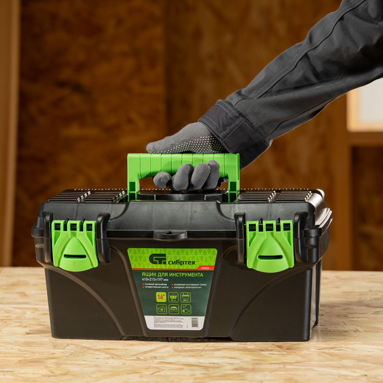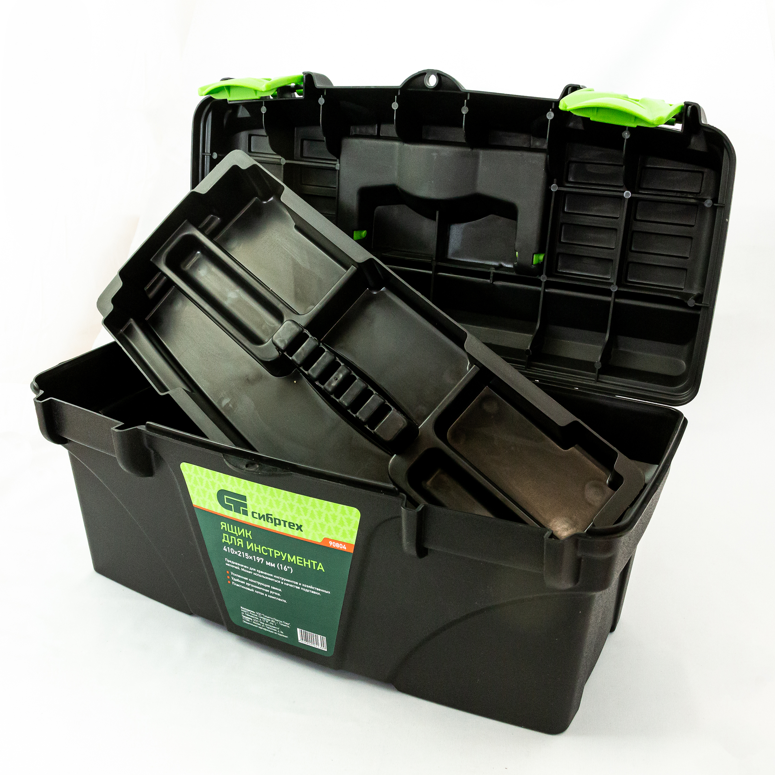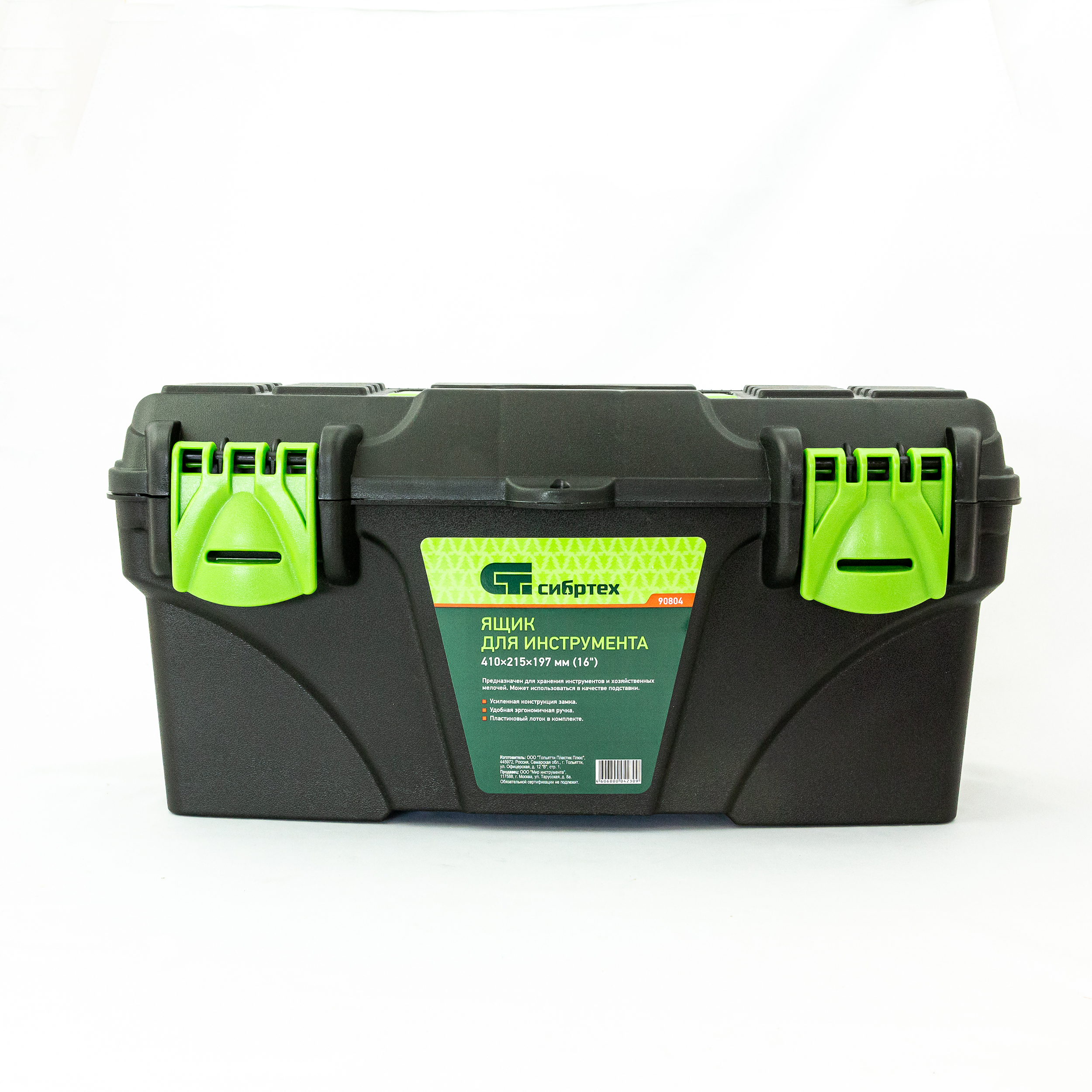<p>Ящик для инструмента Сибртех 90804 из пластика, размером 410 х 215 х 197 мм (длина 16"), — удобное вместилище для инструментов, бытовых мелочей, рыболовных снастей. На крышку нанесена измерительная шкала в сантиметрах и дюймах, поэтому можно проводить измерения, даже если под рукой нет линейки. Ящик пригодится в поездке, на рыбалке, а также дома, на даче или в гараже.</p><h2>Преимущества</h2><ul><li>Усиленная конструкция — замки и верхняя крышка установлены на 3-рядные петли, поэтому ящик выдерживает значительный вес.</li><li>Рациональное использование внутреннего пространства — съемный лоток с ручкой удобен для хранения метизов и других мелких предметов.</li><li>Прочность — корпус, усиленный ребрами жесткости, устойчив к повреждениям в результате случайного удара или падения.</li><li>Удобное перемещение — на крышке имеется эргономичная ручка.</li></ul>