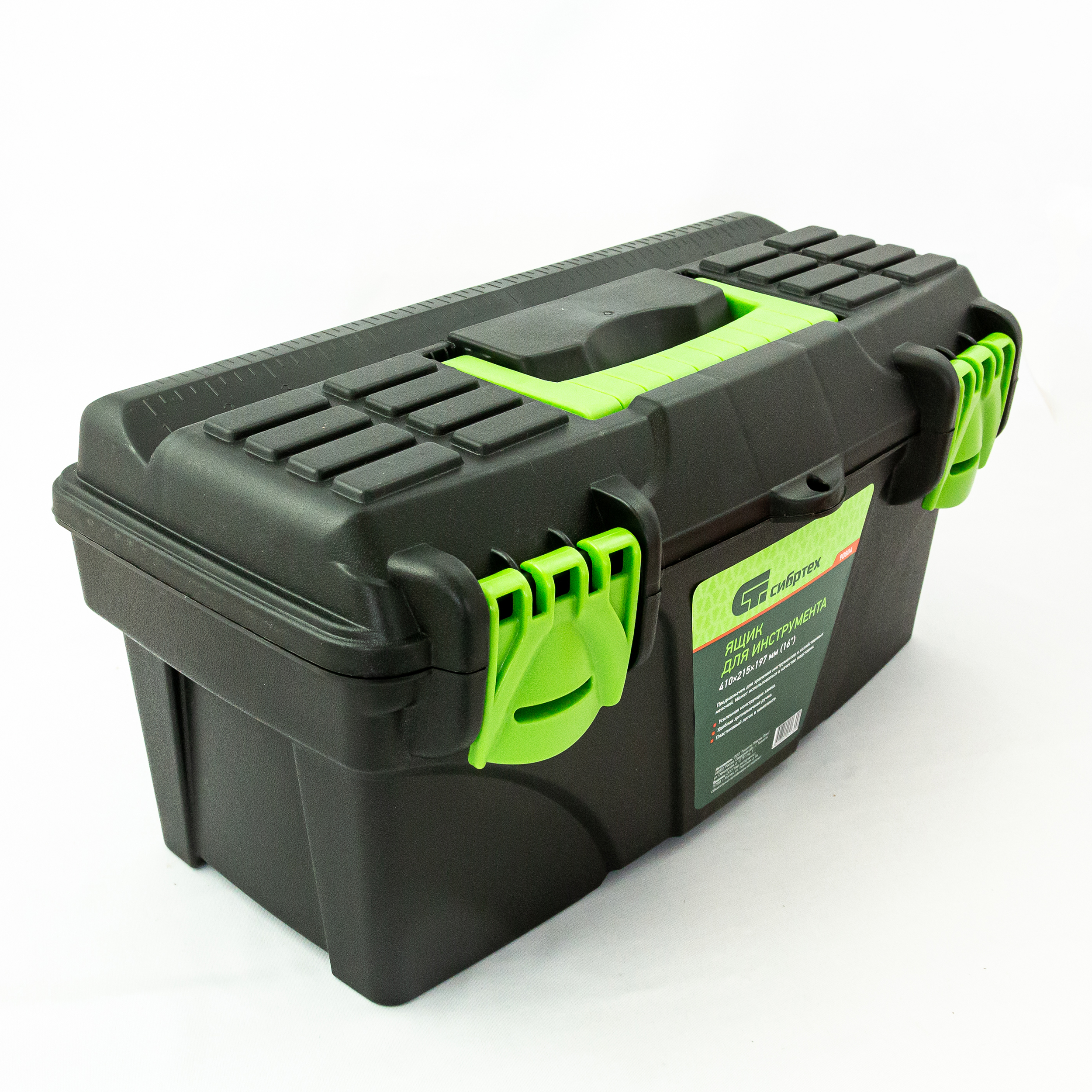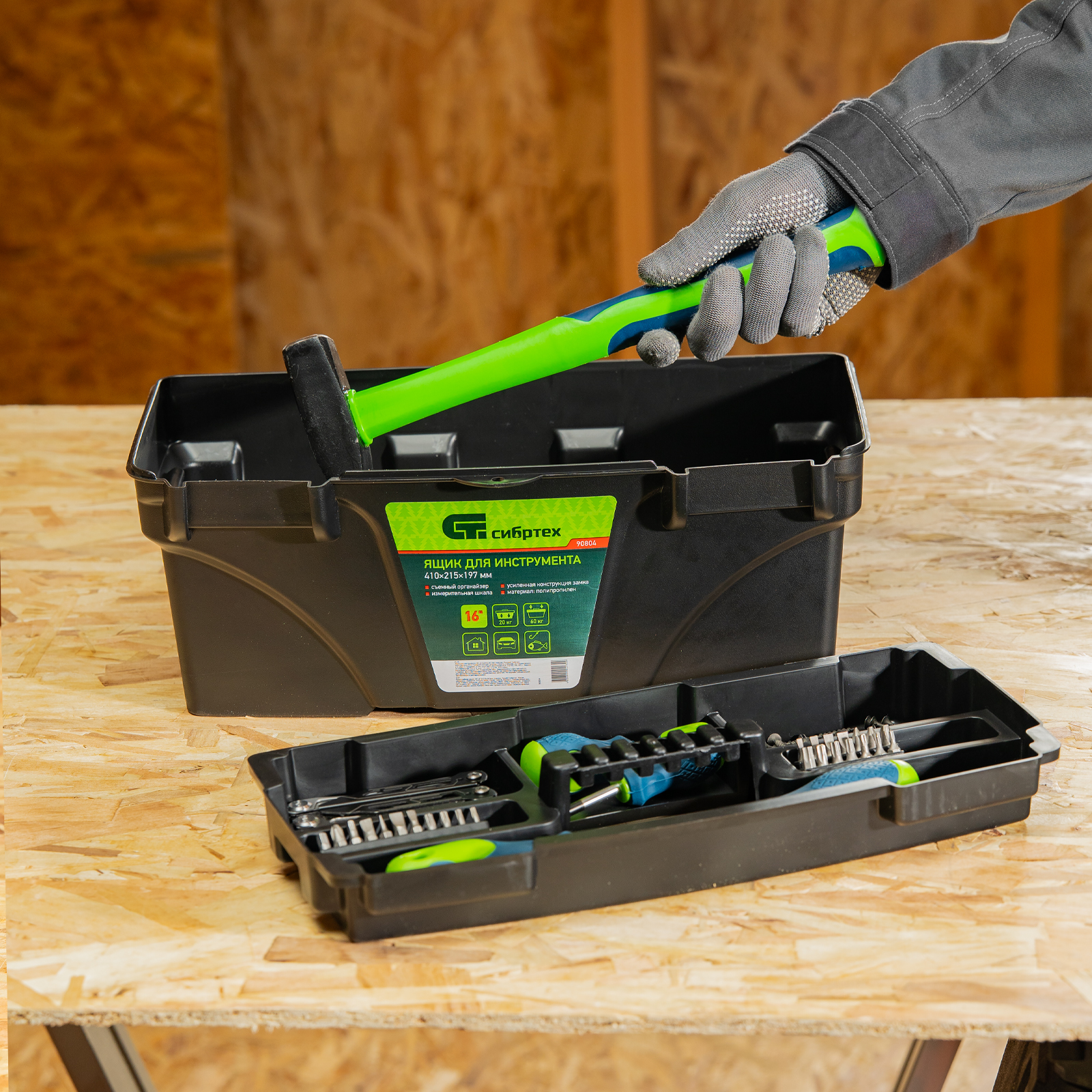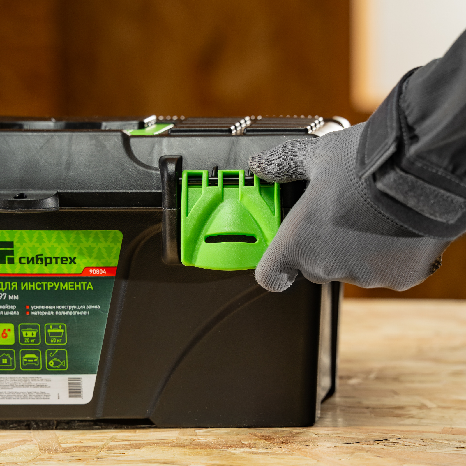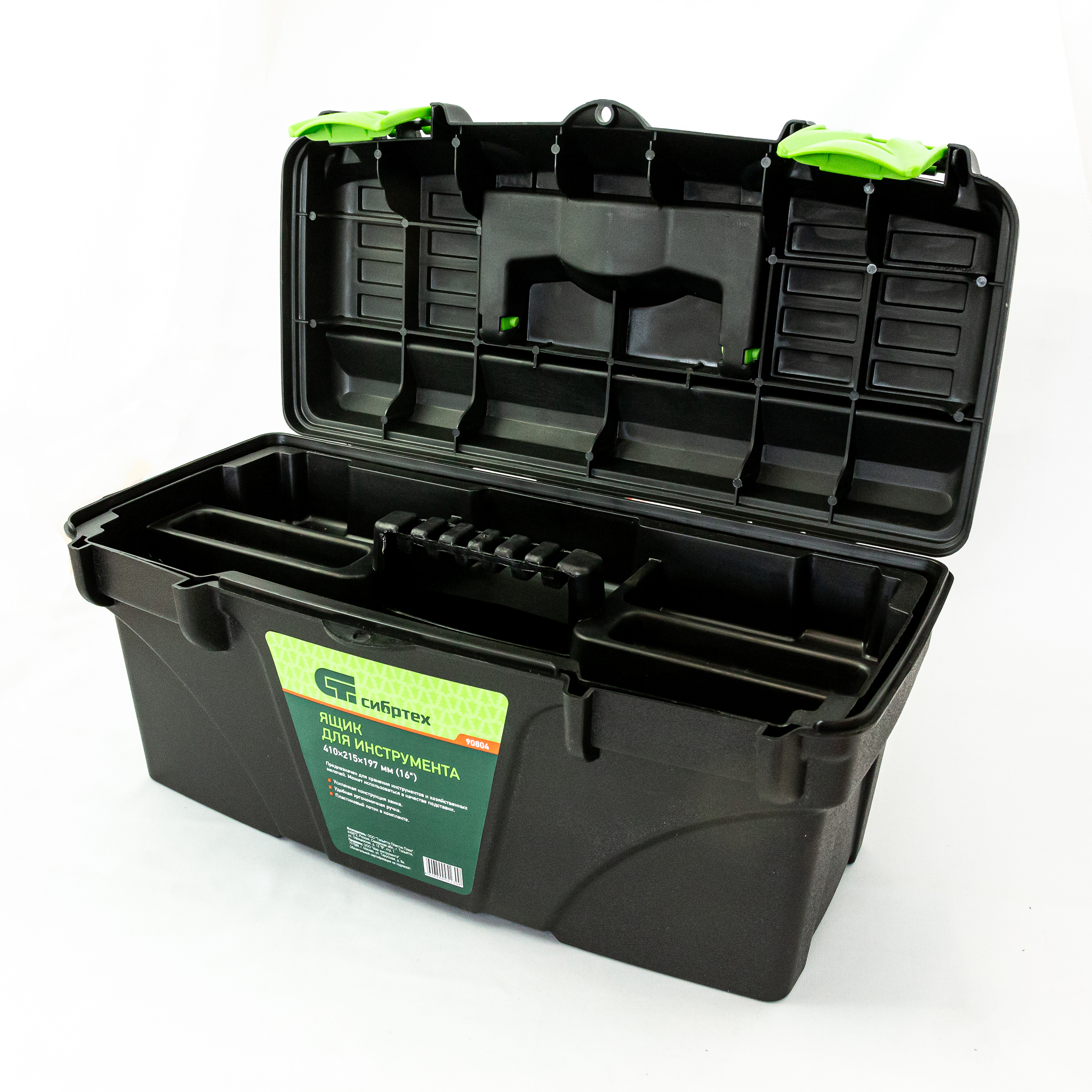 <p>Ящик для инструмента Сибртех 90804 из пластика, размером 410 х 215 х 197 мм (длина 16"), — удобное вместилище для инструментов, бытовых мелочей, рыболовных снастей. На крышку нанесена измерительная шкала в сантиметрах и дюймах, поэтому можно проводить измерения, даже если под рукой нет линейки. Ящик пригодится в поездке, на рыбалке, а также дома, на даче или в гараже.</p><h2>Преимущества</h2><ul><li>Усиленная конструкция — замки и верхняя крышка установлены на 3-рядные петли, поэтому ящик выдерживает значительный вес.</li><li>Рациональное использование внутреннего пространства — съемный лоток с ручкой удобен для хранения метизов и других мелких предметов.</li><li>Прочность — корпус, усиленный ребрами жесткости, устойчив к повреждениям в результате случайного удара или падения.</li><li>Удобное перемещение — на крышке имеется эргономичная ручка.</li></ul>